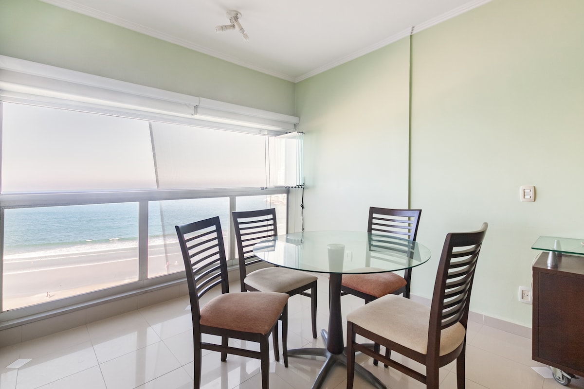 Appartement aan het strand, met uitzicht op zee! Verhuur bedoeld voor gezinnen, 🌟 2 suites + 1 slaapkamer en 1 badkamer. Airconditioning in alle kamers, een Amerikaanse keuken geïntegreerd met de woonkamer en een glazen balkon met een 🌊 prachtig uitzicht. Wasserette, 1 parkeerplaats en een professionele ijsmachine beschikbaar voor gasten, een groot verschil! Rustige zee, ideaal voor kinderen. Een warme en functionele sfeer. Geen feesten. Recreatiegebied niet beschikbaar vanwege appartementregels.