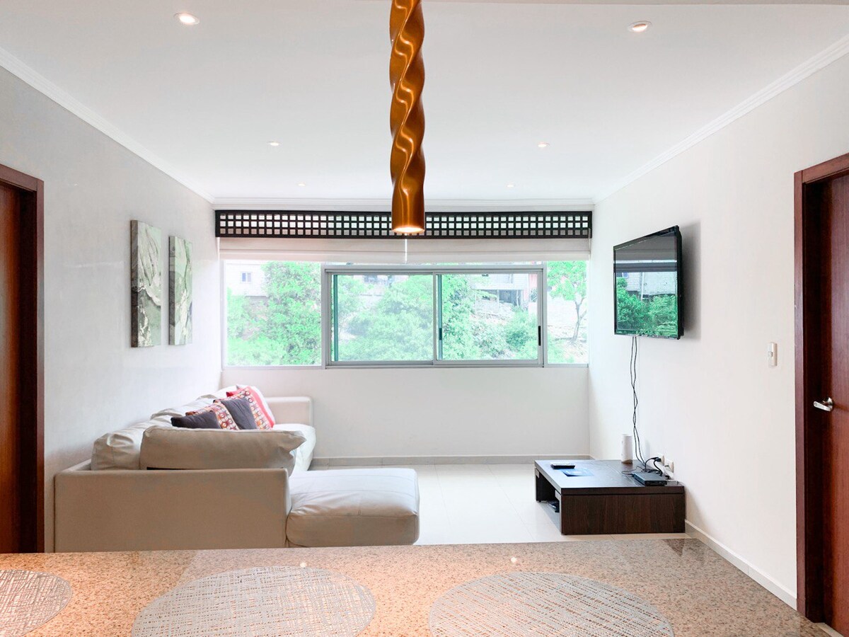 Gemeubileerde suite, perfect voor 2 à 3 personen met uitstekende locatie. Het heeft alle voorzieningen zodat je je je thuis voelt en je een leuke ervaring kunt hebben. *Voorzieningen: - TV 's met Netflix en Youtube - Snelle WiFi - Zwemmen - Fitnessruimte *Locatie: Naast Omnihospital (24/7 apotheek) Luchthaven op 5 minuten rijden Tegenover de Mall del Sol Dichtbij het Convention Center. *Parkeren: - Openbaar (gratis buiten het gebouw) - Privé ($ 8 tot $ 10 per nacht op basis van beschikbaarheid)