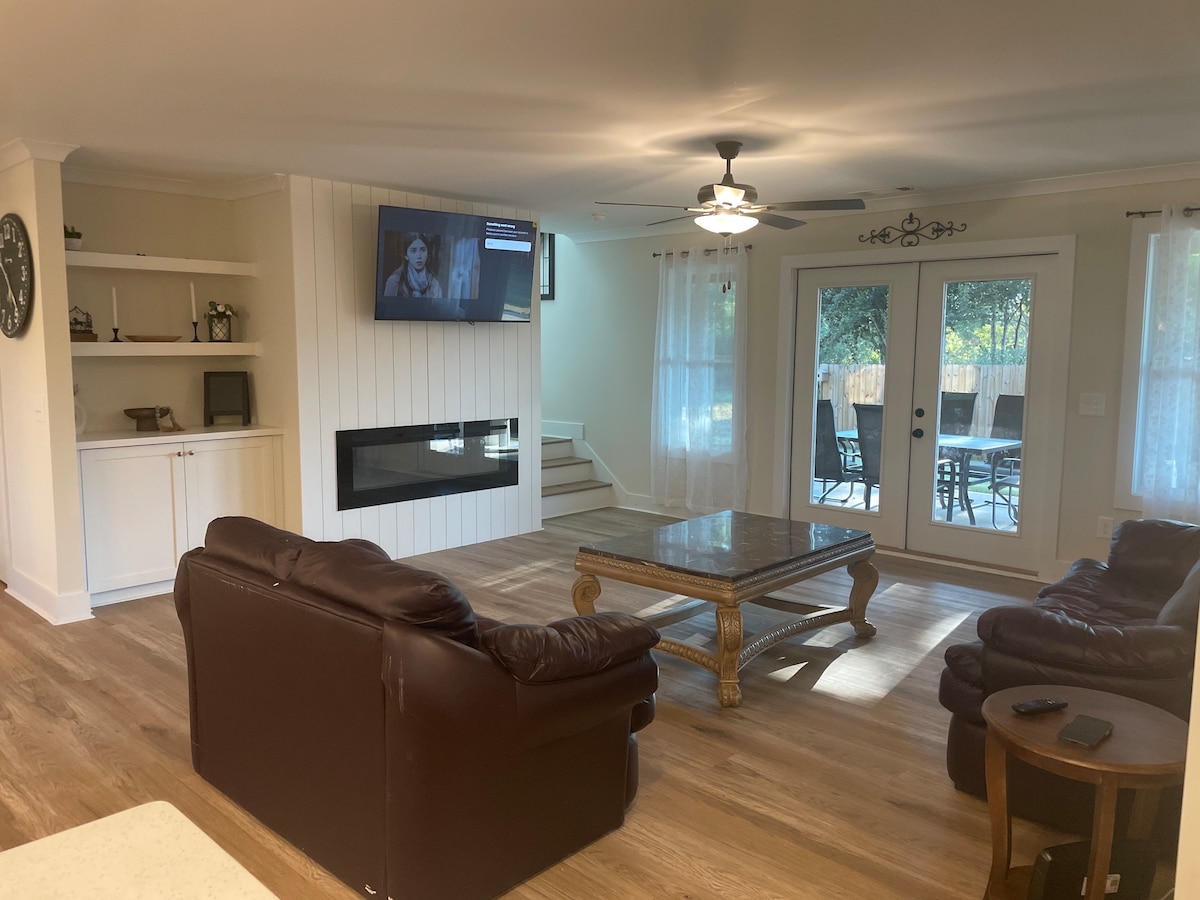 Our Neoclassical home rests on a hillside acre among towering Georgia Pine. Read or watch movies in the library, (the fireplace works) gather in the sun porch, make yourself at home in the dining room, tell stories in the living room, or entertain on the back terraces, beside the Koi pond and waterfall. We have 3 full baths and 2 half baths. Note: The airbnb software isnt able to list 1/2 baths. Roku, free channels, feel free to login and use your personal streaming accounts.