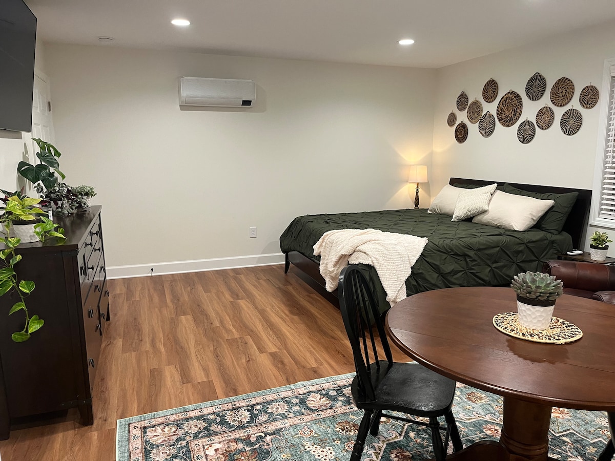 Gezellig en ademend 2 kamers + bad, schoon is een prioriteit. Woonkamer heeft een bank met veren, 3 stoelen, tafel, bureau, middelgrote koelkast/vriezer, magnetron, broodrooster en broodroosteroven, koffiezetapparaat en benodigdheden. JA WIFI & 31" TV. GEEN KEUKEN. Vier treden leiden naar een slaapkamer op een lager niveau met verduisteringsgordijn bij de deur, één kast en een badkamer. Volledig bed. Douchekop steekt uit vanuit hoek van trap. Lage plafonds. Eigen patio aan je buitendeur met een parkeerplaats voor de voorplaats. Nooduitgang bovenaan de trap.