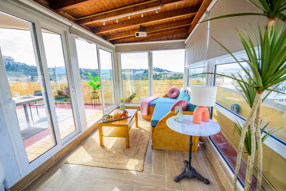 Wake above Athens with uninterrupted views of the Acropolis and the Temple of Hephaestus just beyond your terrace. This sunny rooftop one-bedroom balances clean modern design with the texture of the old city, anchored by a private sunroom that gathers the Athenian light. Local markets, cafés, rooftop bars, and ancient paths are steps away. Mornings begin on the terrace, evenings end with a film on the projector, with ancient ruins illuminated in the distance.