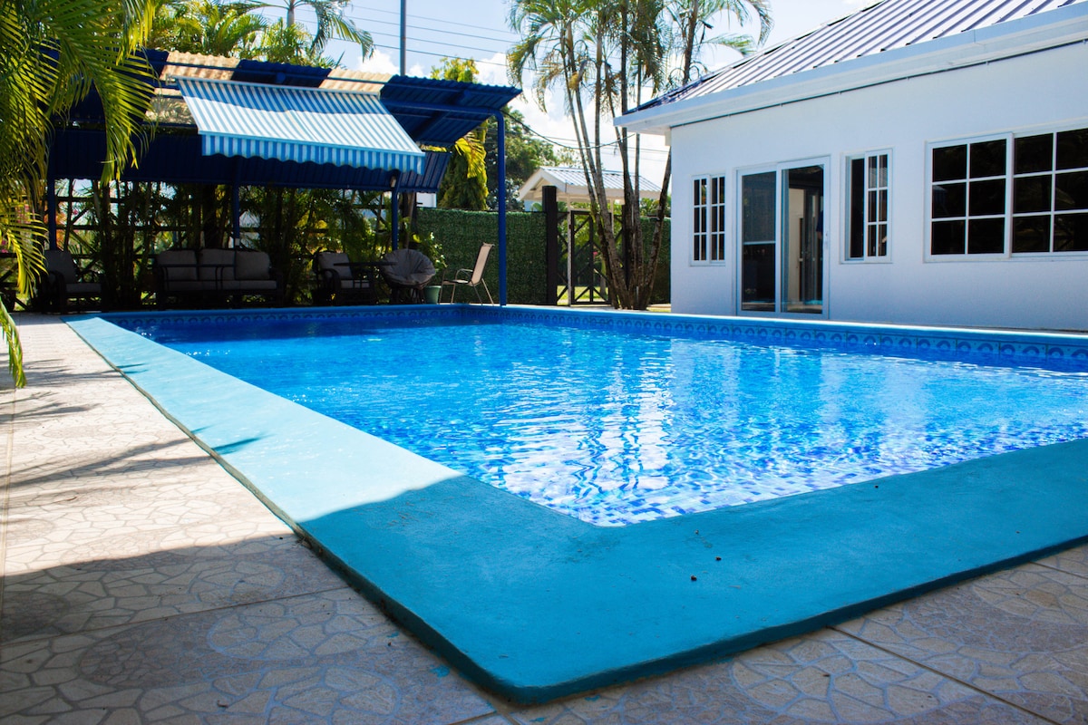 Moderne villa met STARLINK wifi, perfect voor een gezin van maximaal 6 personen (inclusief baby's en kinderen). Geen RESERVERINGEN DOOR DERDEN. BOEK NIET ALS JE NIET REIST. GEEN HUISDIEREN. GEEN FIETSEN. Volledig omheinde en beveiligde gemeenschap. 1 hoofdslaapkamer met queensize bed. 1 gastenkamer met 2 volledige bedden, Wasmachine/droger, Volledig uitgeruste keuken met eettafel/4 stoelen. Er is een gedeeld zwembad, direct voor onze villa, en ook bij het hotel als u daar wilt zwemmen. Buiten BBQ-grill