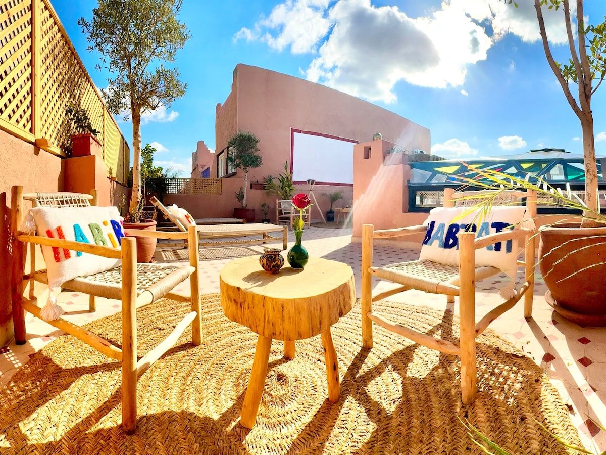 Gelegen aan de voet van het Atlasgebergte, in het hart van een weelderige tuin en omgeven door eeuwenoude olijfbomen, biedt onze op Berber geïnspireerde kamer je een authentiek toevluchtsoord. Je kunt genieten van een gedeeld zwembad en een serene omgeving, terwijl je toegang hebt tot een veelheid aan activiteiten die door ons etablissement worden aangeboden: pottenbak- en kooklessen, quadbiken, kameelritten, paardrijden en zelfs paragliden voor de avonturiers. Een onvergetelijke ervaring wacht op je.