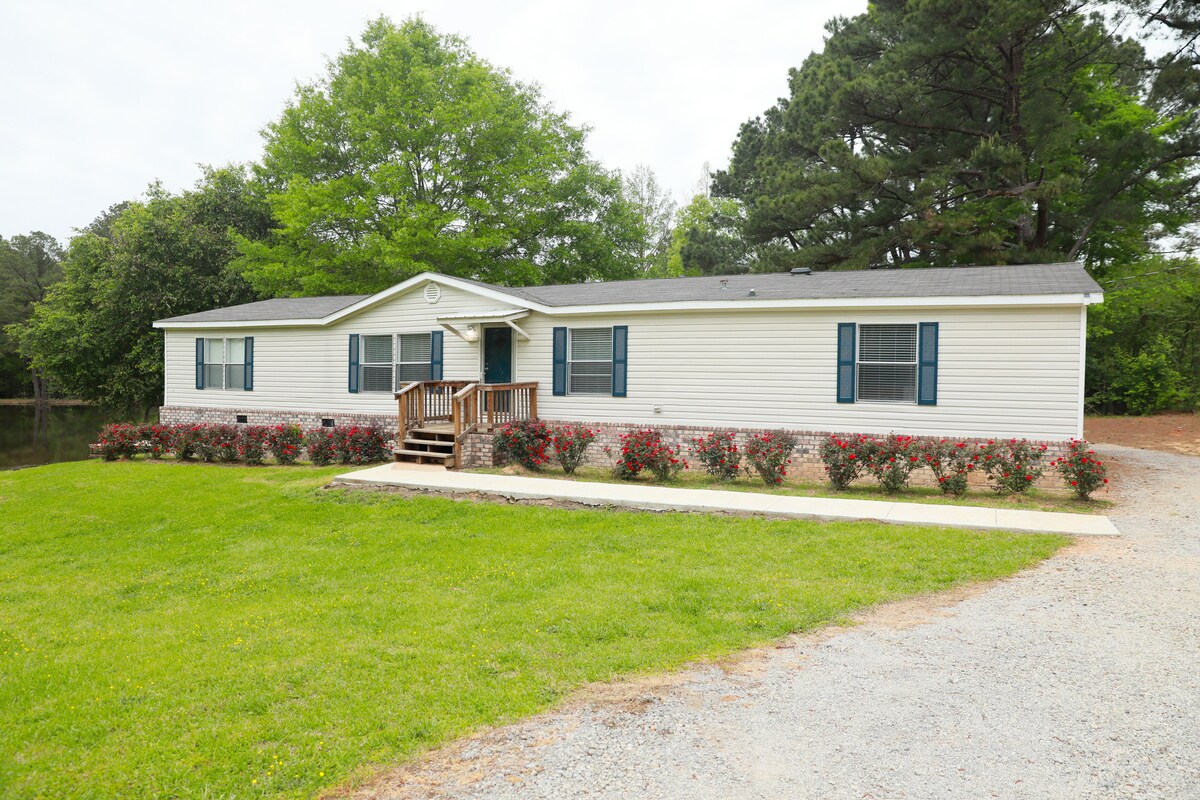 Ontspan met het hele gezin op deze rustige plek om te verblijven. Een vier slaapkamers, 2 badkamers, 2000 vierkante voet, onlangs gerenoveerd, 2012 model dubbel breed, dat is comfortabel verscholen op 1/4 mijl van de gebaande paden. We bevinden ons op slechts 4 km van Dollar General en op 8,5 km van Walmart. Toegang tot een vijver van 1,5 hectare, met een 40’ pier. Vissen als je wilt! We hebben ook een mooi grillterras en een pooltafel binnen voor je plezier.