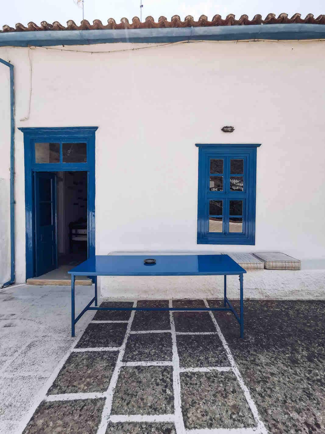 Hydra-huis met een blauwe deur - een traditioneel oud huis gebouwd in de achttienhonderd en door onze familie omgetoverd tot een zomerhuis in de jaren 80. Het huis ligt aan de voet van de heuvel van Hydra 's stad, wat het het voordeel geeft van een goed uitzicht zonder de steile trappen die de meeste huizen moeten bereiken en ligt op 7-10 minuten lopen van de haven. Als je de paar treden naar het huis beklimt, bereik je een veranda ter grootte van het huis met een panoramisch uitzicht dat zich uitstrekt van de berg tot aan de zee.