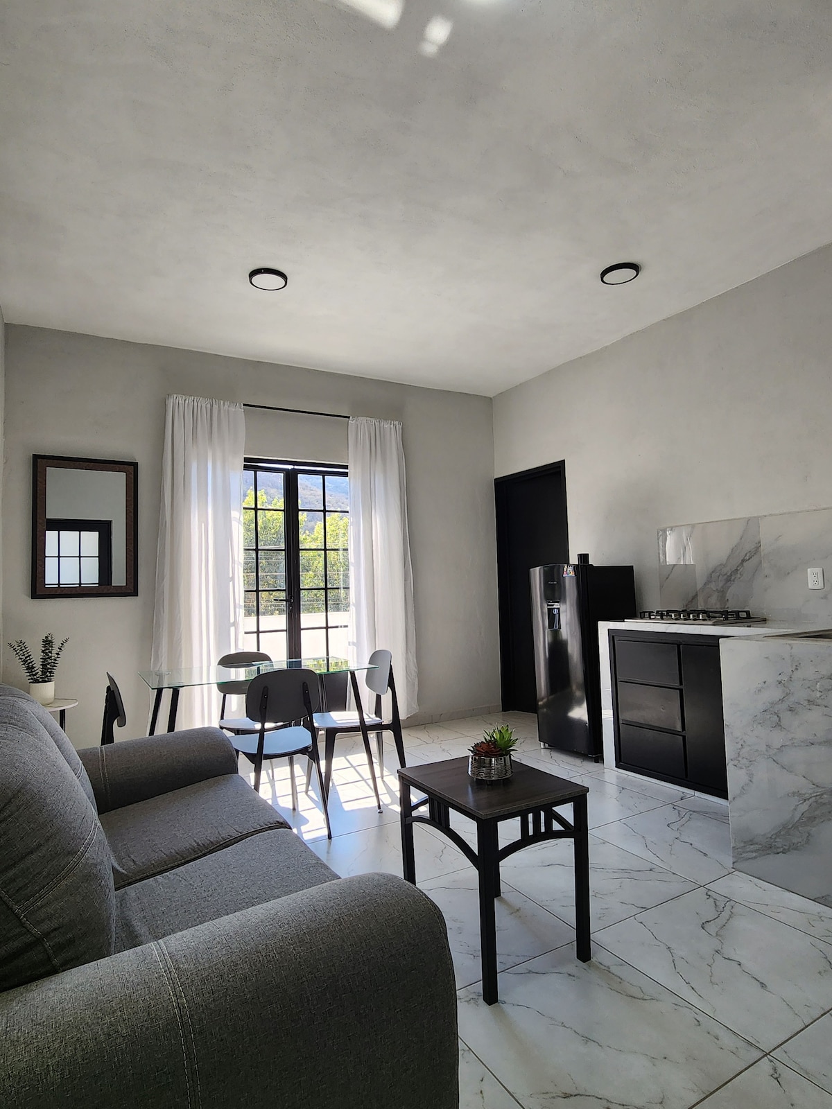 Kick back and relax in this calm, stylish space. Cozy loft located just three blocks from El Paseo de las Rosas. It has a comfortable layout, equipped kitchenette and air conditioning for a fresh and pleasant stay. It also enjoys a large terrace ideal for relaxing or sharing moments outdoors. WiFi and Cable on site.