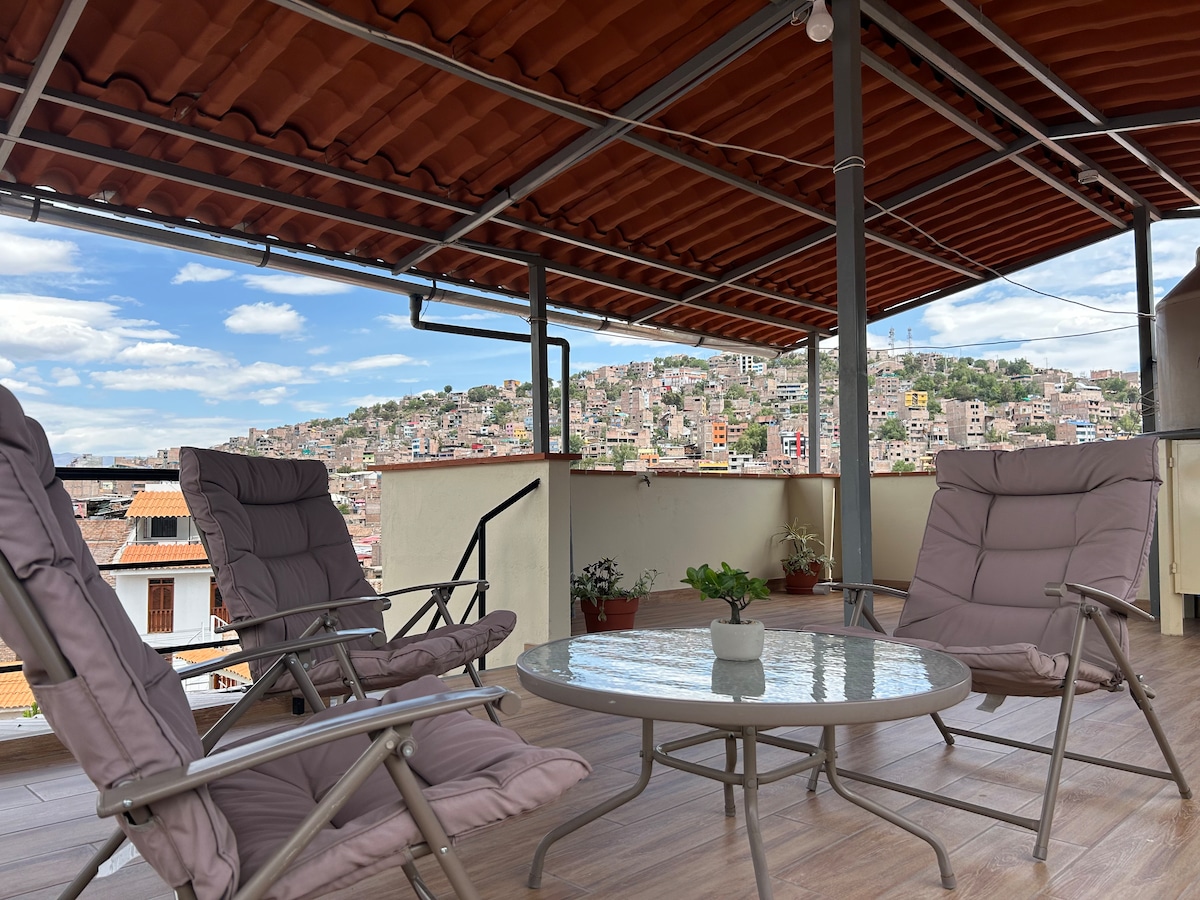 Studio type mini spa met een comfortabel bed, eigen keuken/eetkamer, eigen badkamer met warm water en een werkruimte. De studio is licht en luchtig, met uitzicht op een terras waar je kunt zitten om te lezen, te eten, te nemen of gewoon te genieten van het uitzicht op de stad en de sterren te zien. Het is een intieme ruimte voor één of twee personen met alle voorzieningen. U kunt parkeren buiten de accommodatie (het is een rustige straat). Als verhuurder kijken we altijd uit naar je verblijf bij ons.