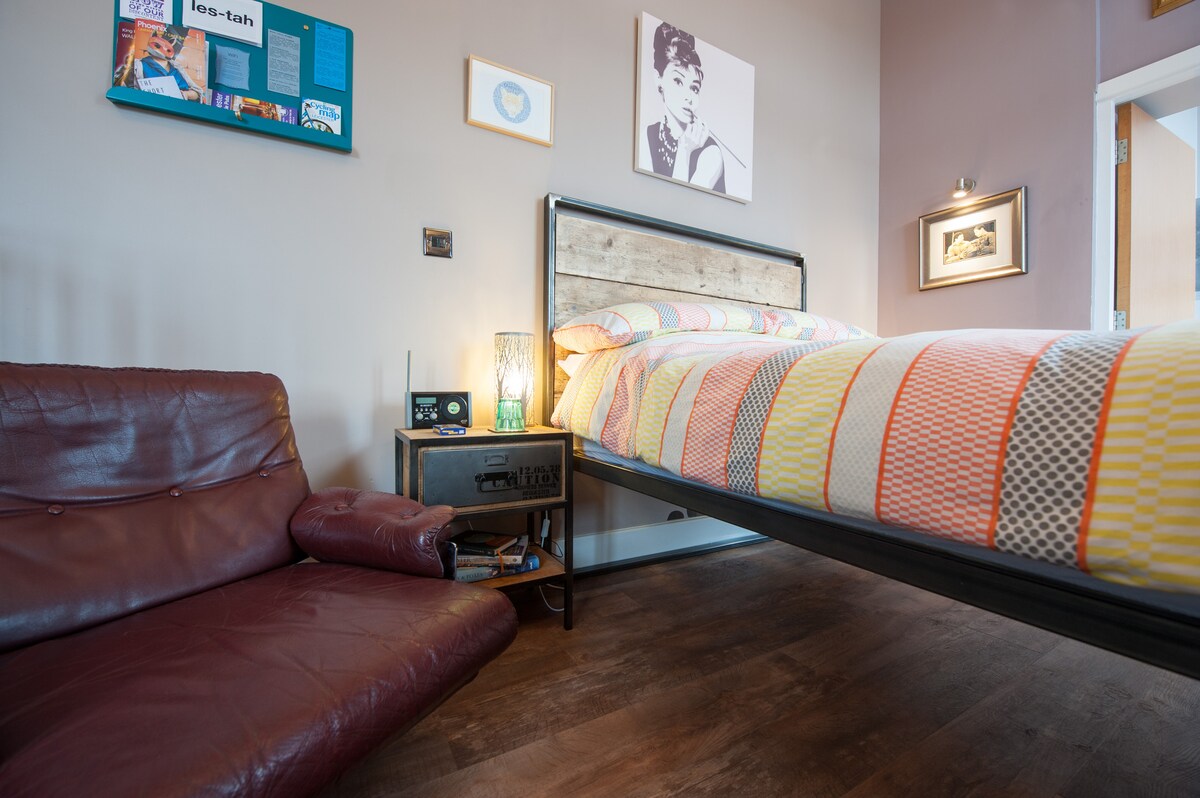Welkom bij ons appartement op de 3e verdieping in ons geliefde 3 verdiepingen tellende traditionele Victoriaanse herenhuis gebouwd in 1895, met veel originele kenmerken. Je privé-appartement is volledig gescheiden van onze woonkamer. Slaapkamer, woonkamer, badkamer met bad en inloopdouche, ingerichte keuken, centrale verwarming. Gratis parkeren op straat.