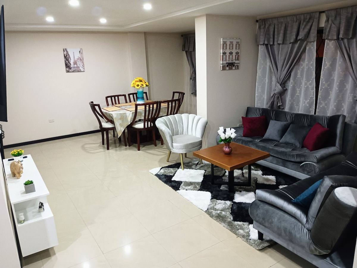Gezellig onafhankelijk familieappartement in een veilige omgeving, met een park en sportgebieden direct voor de deur. Op slechts 2 minuten van het moderne Plaza WAYRA, op 15 minuten van het centrum en dicht bij winkels, restaurants en het winkelgebied. Het heeft 2 slaapkamers, een grote badkamer, een woonkamer, een eetkamer en een complete keuken. Bussen voor het huis en ziekenhuizen zoals SOLCA, IESS en Regional op loopafstand. Ideaal voor comfortabel verblijf. Voor grote groepen is er een ander appartement op de 1e verdieping beschikbaar.