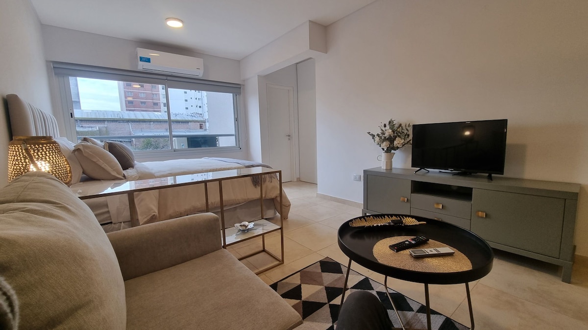 Appartement in Scandinavische stijl in het hart van Bahia Blanca, op 4 blokken van het centrale plein. Een half blok van het Gemeentelijk Ziekenhuis en drie blokken van het HAM-ziekenhuis. Een strategische locatie, ook dicht bij Universidad del Sur en UTN. Ideaal voor werk of rust, met lichte ruimtes en details die zijn ontworpen voor je verblijf. Het heeft een smart-tv in de slaapkamer en woonkamer, wifi, wasmachine, uitgeruste keuken, beddengoed en handdoeken. Inclusief een eigen garage op een halve straat van het gebouw zonder extra kosten.