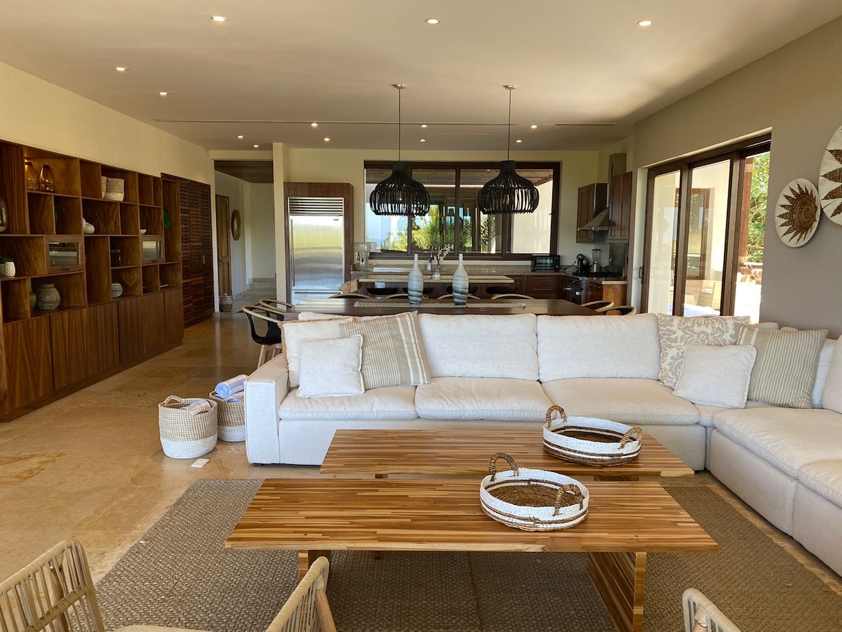 Zak weg in de relaxte hoekbank van deze ontspannende, vrije accommodatie met eigenzinnige houten verlichting en gepolijste stenen vloeren. Luxe woning aan zee, volledig ingericht en voorzien van accessoires, het hele jaar door te huur. De perfecte omgeving voor een gezinsvakantie, een excursie met vrienden of een snel romantisch uitje. Een persoonlijke chef-kok is inbegrepen bij de reservering tijdens je verblijf, zodat je de beste en geweldige tijd op het strand kunt hebben. (eten en drinken zijn niet inbegrepen).