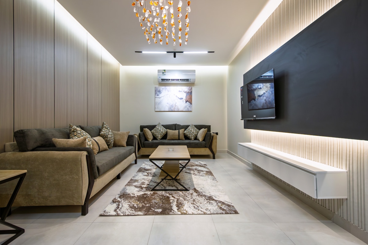 Mooie accommodatie. In de wijk Sundus (oase). Bijzonder en rustig. Oppervlakte 35 m. Modern meubilair. Audiosysteem. 65-inch smart-tv. Slimme ingang. Interne isolatie. Geïntegreerde koffiehoek. Hoog niveau van netheid. Luchtzuiveraar van Philips. Aromatherapie-apparaat. Automatische zonwering voor slaapkamerraam. Nieuw residentieel plan (Sondos) op Tahlia Street en dicht bij diensten. 10 minuten van Al Yasmeen Mall, 17 minuten van de luchthaven, 10 minuten van de trein naar de twee heilige moskeeën, 25 minuten van de Corniche.
