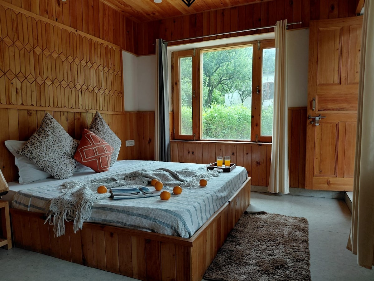 Relax with the whole family at this peaceful place to stay. * Wifi * Waterfall * Food service & caretaker * Private garden * Pinewood architecture * Safe Parking * Local tips * Bonfire Please note - There is 200mtrs trek from parking spot to the property, We will pick your luggage. - Price includes stay only. Breakfast, Meals, Room heaters, Bonfire & All other services are excluded.