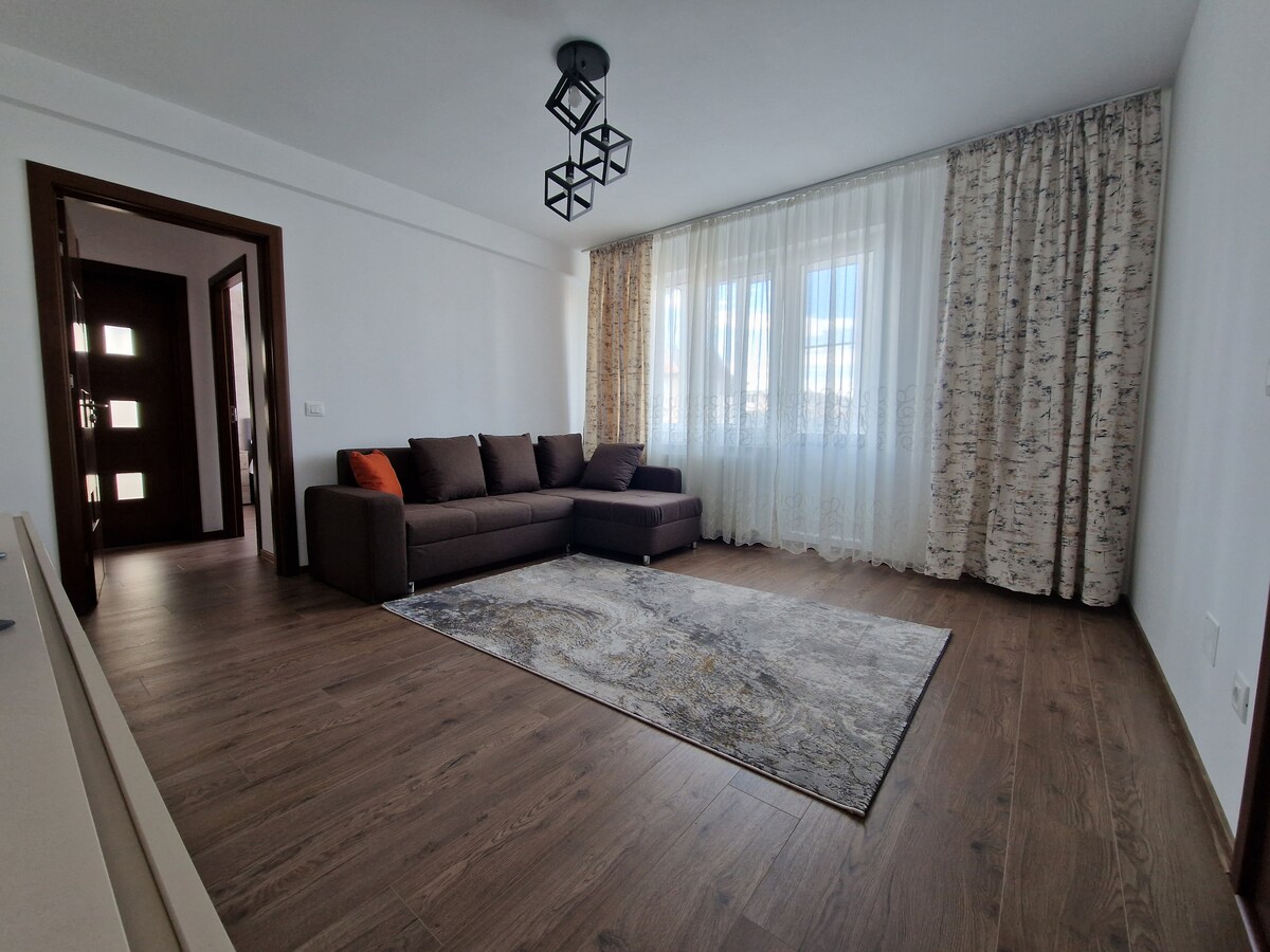 Sudio modern cu 2 camere, situat într-o zonă liniștită. Ideal pentru familie sau un cuplu, acest apartament oferă confort fiind izolat termic si fonic. - Living spațios cu canapea extensibilă, TV cu ecran plat - Dormitor cu pat matrimonial, dulap generos - Bucătărie deschisă, echipată cu aragaz, cuptor, frigider, mașină de spălat rufe - Baie modernă cu cabină de duș cu hidromasaj si radio - Proximitate față de supermarket-uri, restaurante,cafenele, parcuri,spital - Locuri de parcare cu plata