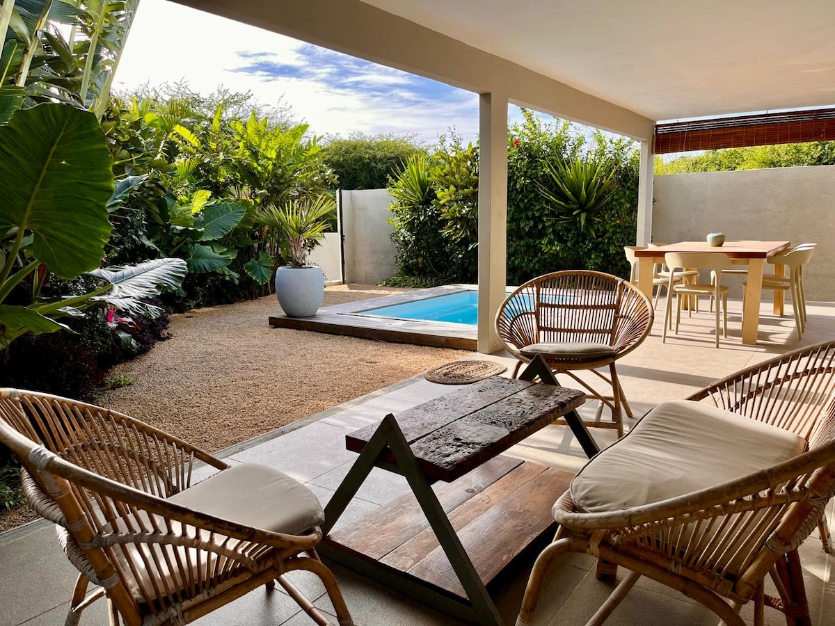 Beautiful Modern Beach style duplex in Bain Boeuf, only a few minutes walk from the beach & dive school, in a very peaceful neighbourhood. Large open living areas with integrated kitchen, enclosed courtyard with the feel of being open, private pool and outdoor shower to freshen up. Gas BBQ to enjoy under the stars. Our residence is 400m from a beautiful beach, in a very quiet area close to open land, you can see cows pass by occasionally. Ocean life at its best-with a modern flair of comfort.