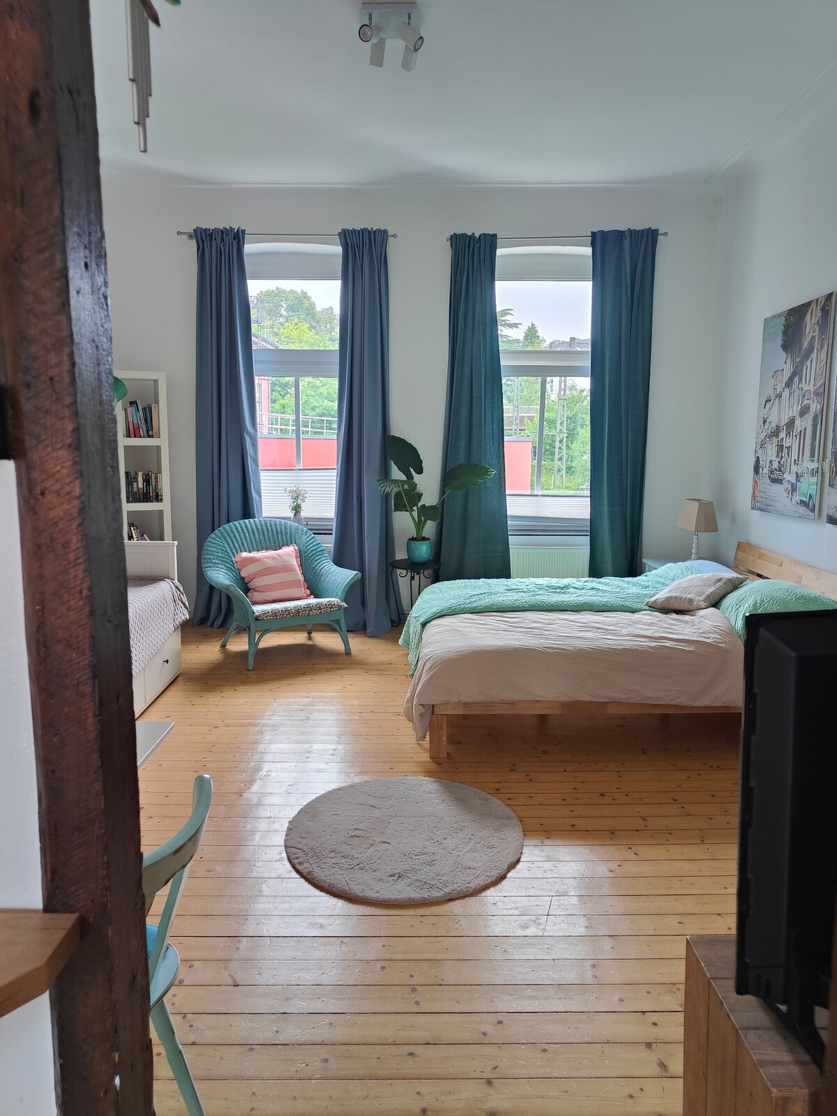 Altbauwohnung, 1,5 Raum, 55 qm, Dielenboden im Jugendstilhaus Essen-Werden. Bett 1,60 für 2 Personen u. Ausziehsofa für 2 Pers. im selben Raum. An der Ruhr, 200 m zum S- Bahnhof und Bushaltestelle Ri Essen u. Düsseldorf, Gruga und Volkwangmuseum in 10 min erreichbar, Altstadt u. Folkwangmusikhochschule in 3 Gehmin. Fahrradfahren u. Wandern zum Baldeneysee, Cafe/ Restaurant Dolcinella neben an, Fahrradkeller vorhanden. Für berufstätige Pendler, Messebesucher und Urlauber und Familien geeignet.