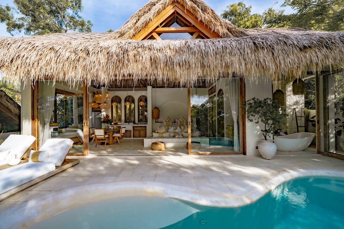 Ervaar het ultieme eco-luxe leven in Munay Wasi's Villa Q 'ente, een prachtige 1BR boomtop villa in een serene omgeving van Uluwatu. Dit verborgen toevluchtsoord is ontworpen om comfort te combineren met adembenemende natuurlijke schoonheid en biedt een prachtig uitzicht op zee, zonsondergang en de bergen door de boomtoppen, elegante architectuur, kamerhoge ramen en een traditioneel rieten dak, waardoor een rustige maar luxe sfeer ontstaat. - Infinity tree top lagoon pool - Sauna - IJsbad - Biologisch beddengoed, badjas en slippers