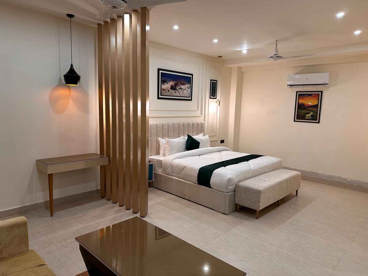 op slechts 3 KM van de luchthaven van Karachi. Volledig voorzien van airconditioning, goed ingerichte vloer met kingsize bed, samen met kast en kaptafel. Inclusief: Saperate Kitchen. Bevestig de badkamer. Ontbijt. Wifi. Parkeren.