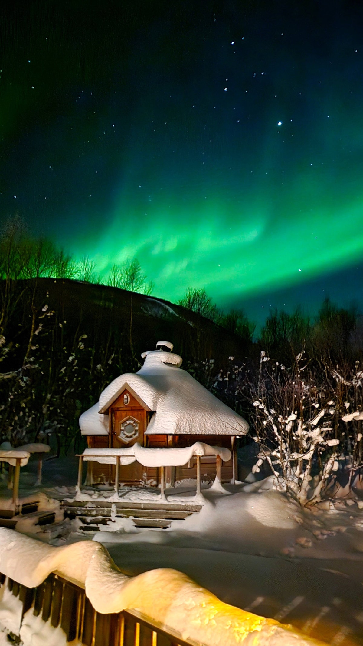 Dit kleine pension heeft het mooiste uitzicht direct vanuit je keuken en slaapkamerraam. Omdat er geen straatlantaarn in de buurt is, is dit de perfecte plek om naar de Aurora te kijken en te genieten van een ontspannend privé-uitje in het Noordpoolgebied. We wonen naast de deur met onze 6-jarige zoon en kat. We zijn op werk vanaf 8.00 uur thuis vanaf ongeveer 16.30uur en in het weekend. Diensten ter plaatse: EV opladen 400kr/ Privétransfer 500kr/ Bubbelbad 1200kr of 100€ voor 2 dagen/ Sauna 500kr of 40EUR per gebruik (alleen contant)