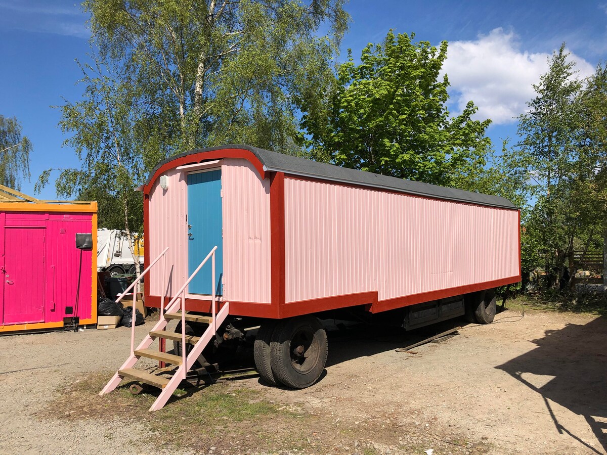 The Strong Man's Wagon is a cozy and striped wagon, perfect for the solo traveller or a tight couple. It has one small double bed (120x200cm), and an extra mattress (90x170cm). Grand Circus Hotel is a hotel consisting of circus wagons! Each wagon is one room, and all twelve rooms are decorated in different themes. The hotel has a shared kitchen, a house with showers and lavatories, and a reception with a minimarket. Welcome to Malmö’s most spectacular accommodation!