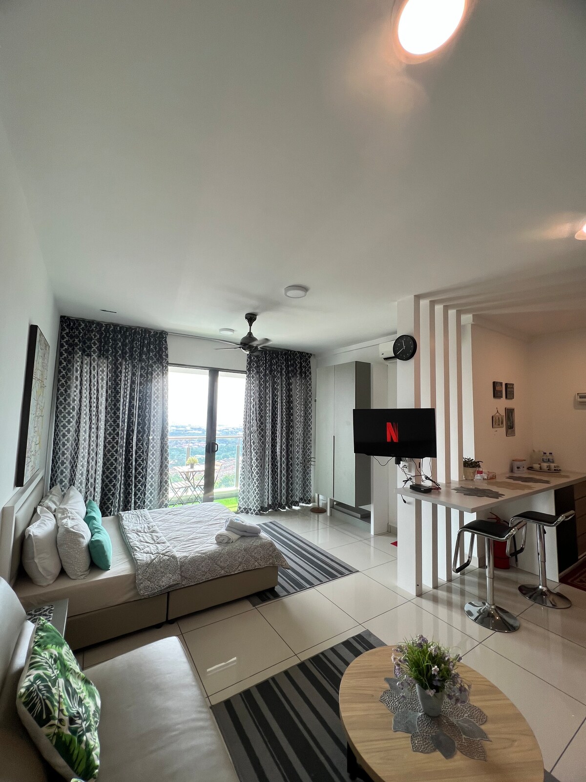 Een minimalistische en mooie studio-eenheid die geschikt is voor 3 personen (gratis) en maximaal 4 personen (met extra kosten en gasten om voorafgaand aan de reservering geen pax te bevestigen), zwembad en uitzicht op de zonsondergang in Bangi. Op steenworp afstand van UKM, GMI, UniKL en Ktm Bangi. Strategisch in de buurt van Jln Reko en mrt Kajang met shuttle. Perfecte plek om te verblijven en redelijke prijs voor staycation, familiebijeenkomsten, evenementen. Leuke buurt, eetjagersparadijs. Het gebouw bezet met handige winkels enz.