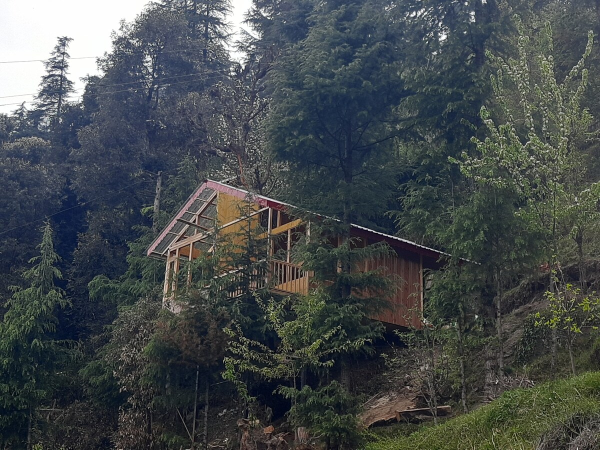Ervaar de perfecte mix van natuur en weelde, gelegen op de Tandi-heuvel in de buurt van Jibhi. Geniet van een luxe duik in een bubbelbad terwijl je geniet van een adembenemend uitzicht direct vanuit je bad. Genesteld weg van weg- en verkeerslawaai, zijn de enige geluiden die je tegenkomt het melodieuze getjilp van vogels. Met een volledig glazen hut zie je misschien zelfs een vliegende eekhoorn of een glimp opvangen van een vallende ster in een serene nachtelijke hemel. Ontspan en geniet van de rust in dit chique, rustige toevluchtsoord.