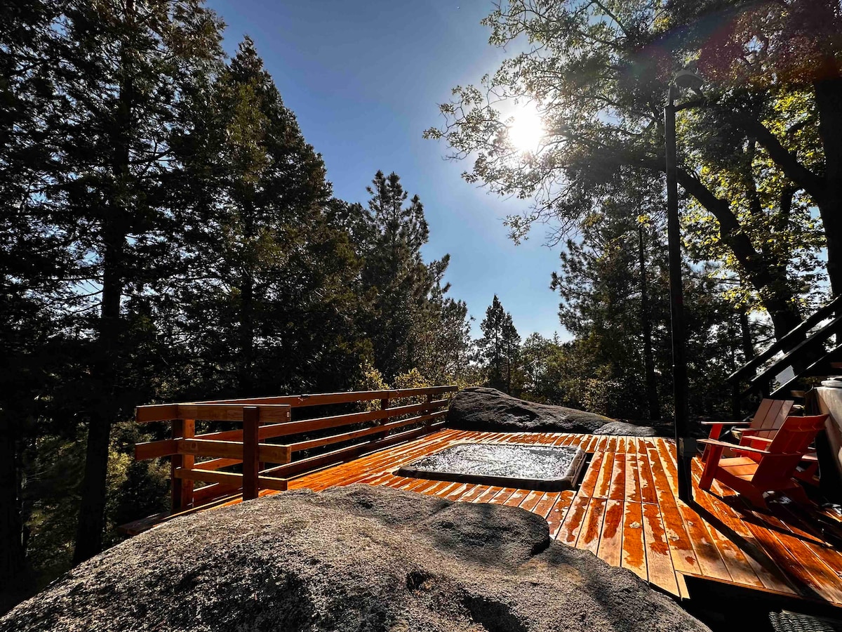 Welkom in onze gezellige A-frame hut aan de rand van Idyllwild California. Dit afgelegen toevluchtsoord is het perfecte plekje om de drukte van de stad te ontvluchten en opnieuw contact te maken met de natuur. De open woonkamer is voorzien van een volledig uitgeruste keuken, comfortabele zitplaatsen en een houtkachel, perfect voor gezellige nachten in. Stap naar buiten en je wordt begroet door de prachtige natuurlijke omgeving. Ontspan op het ruime dek en geniet van het uitzicht op de omliggende bomen, vallei en bergen.