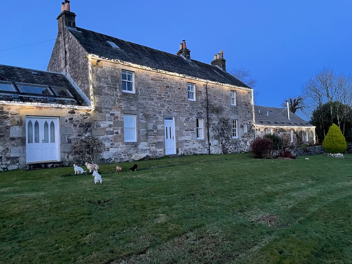Het huisje met eigen kookgelegenheid ligt in een semi-landelijke locatie in ongeveer 2 hectare grond. Het ligt naast een werkende apiary, dus volop de mogelijkheid om honingbijen in actie te zien. Het huis beschikt over 4 slaapkamers, zitkamer, eetkamer, ligkamer, keuken, badkamer, toilet en een natte kamer. Aan de achterzijde van het huis is ruime parkeergelegenheid en een uitgebreide tuin rondom de woning. De locatie stelt je in staat om te genieten van het beste van twee werelden, rust en stilte of ga naar Braveheart en Outlander-locaties