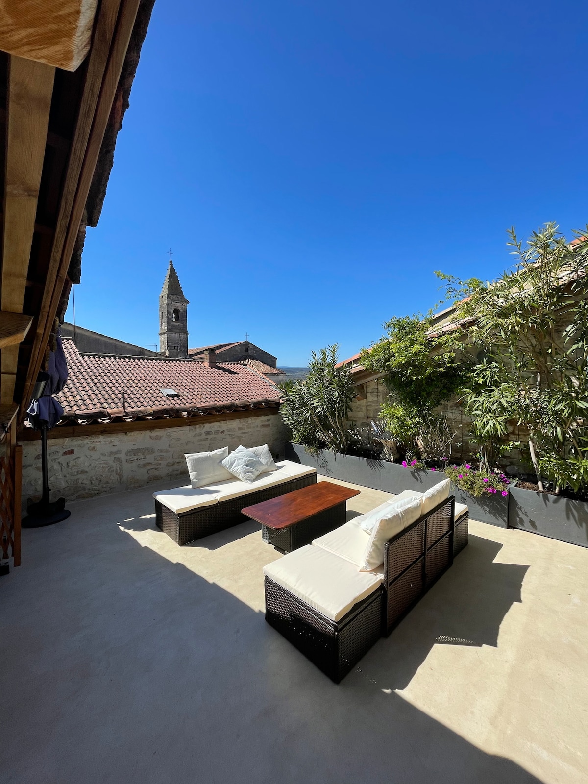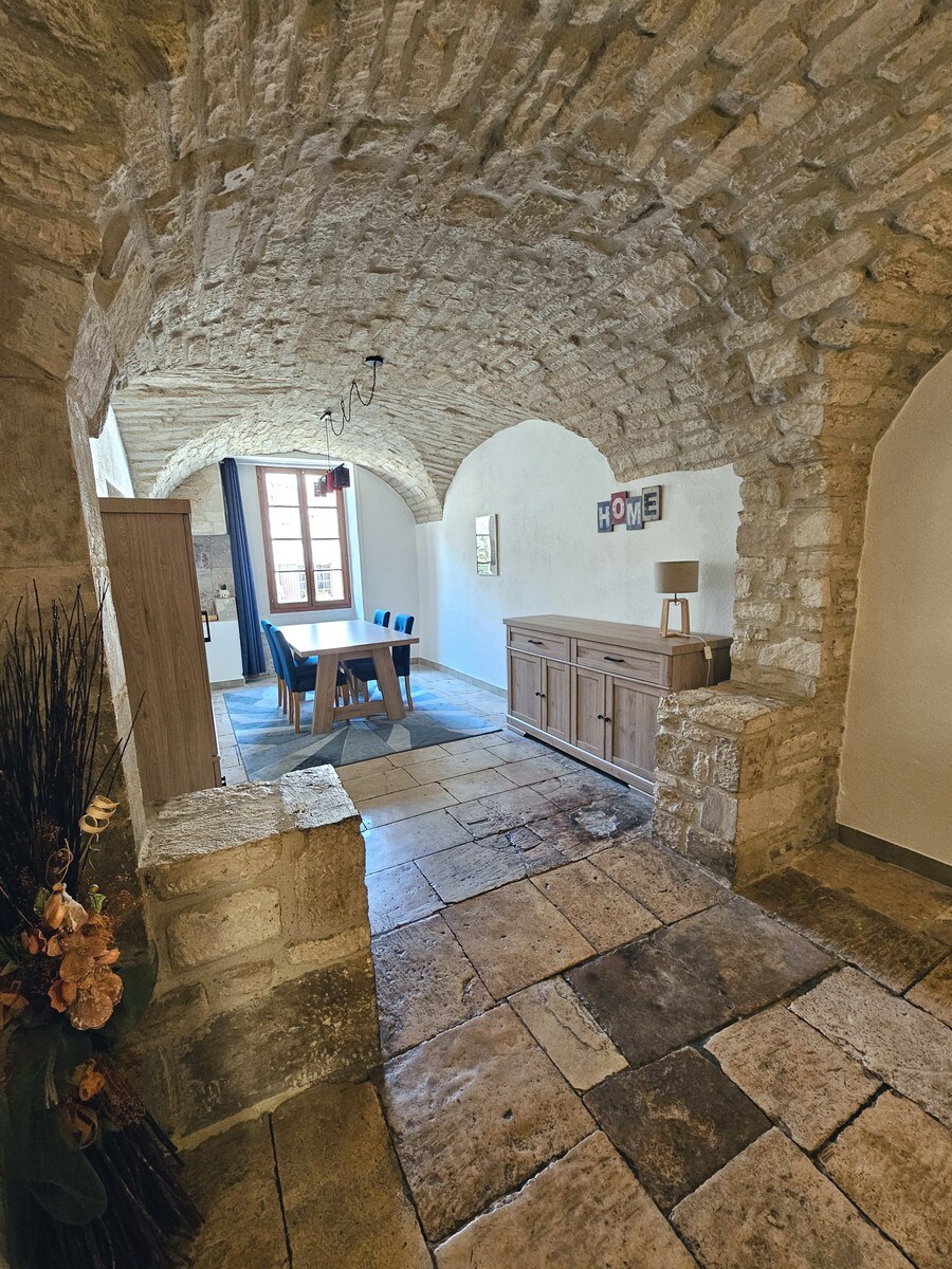 duplexappartement van 110 m2 in gesneden steen ,bestaande uit twee grote slaapkamers , een woonkamer ( 30 m2 ), een woonkamer die kan worden gebruikt als derde slaapkamers ( slaapbank ), twee badkamers met inloopdouches, twee toiletten , een jacuzzi die uitkomt op het terras . Airconditioning in slaapkamers en woonkamer. Internet ( glasvezel ), wifi , verbonden tv,Netflix Het appartement is gunstig gelegen in het centrum van het dorp.