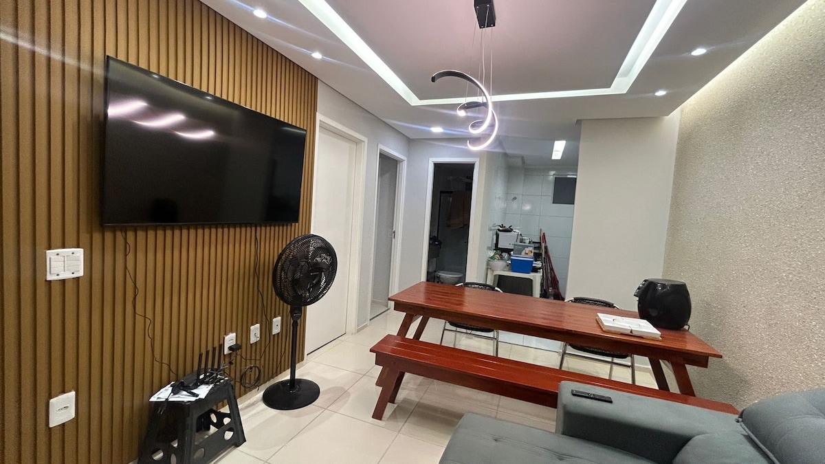 área privilegiada próximo a praia, aqui você e sua familia/amigos acomodam-se em um apartamento confortável, sofa retratil e reclinavel, tv 43" na sala, suíte com ar condicionado, 2 camas sendo uma delas casal e a outra bicama solteiro, wii-fii, lavadora 11 kg, mesa 4 cadeiras, fogão 4 bocas e micro ondas. um condomínio que lhe proporciona segurança e lazer, lhe entregando, piscina adulta e infantil, área kids, quadras esportivas, academia, parquinho e churrasqueira.