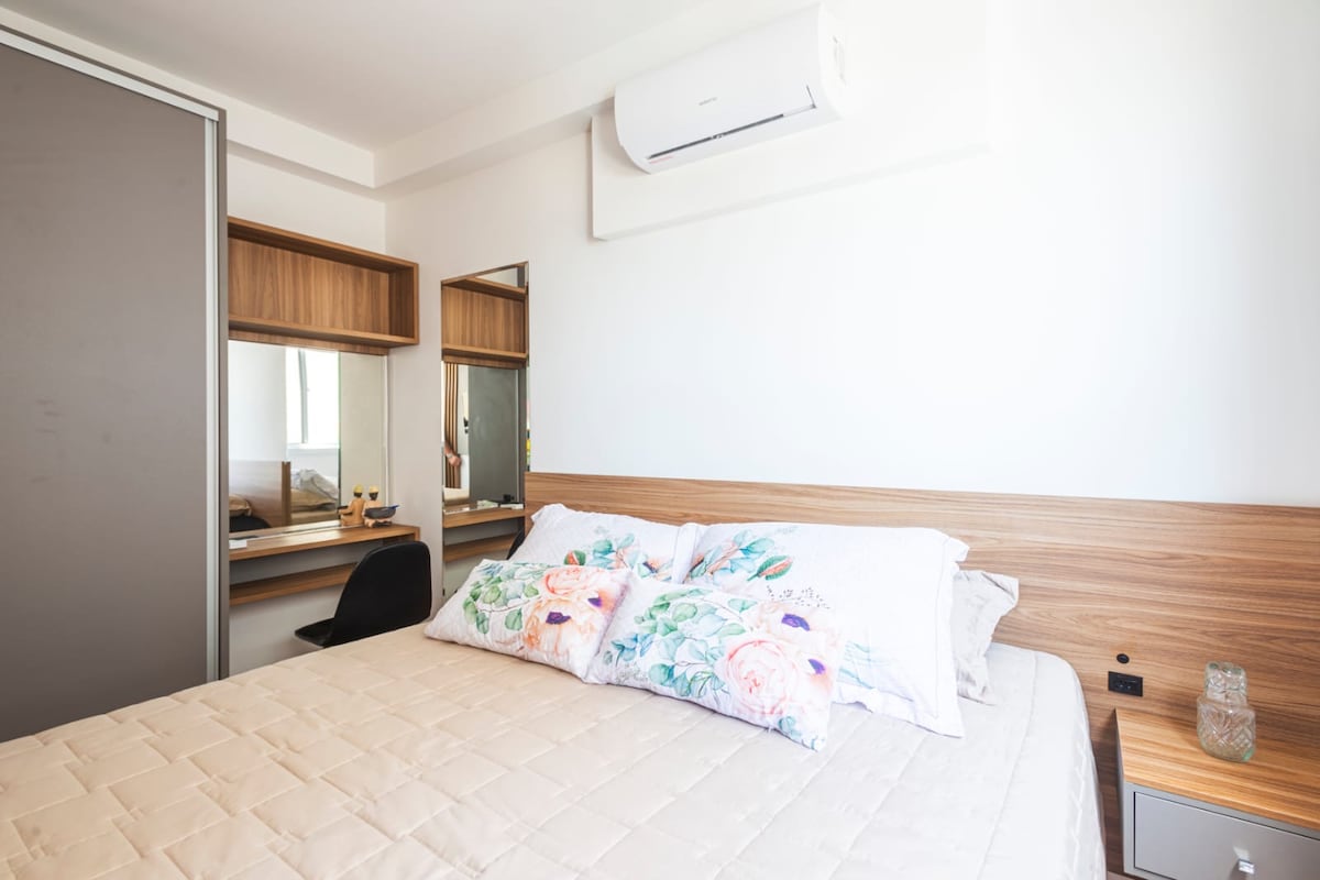 Prachtig uitzicht op de oceaan op het centrale strand. Geniet van een magische nacht aan het geluid van de golven van de zee. In de buurt van bars, markten, winkels, restaurants, naast het centrale plein en de Christus! Compleet, gezellig en charmant! Met een haardroger, strijkijzer, fornuis, koelkast, magnetron, tv (Disney/Star/Globoplay), servies, blender, tosti-apparaat, oven, waterkoker en elektrische pot, airfryer, lakens/hoezen. *We bieden geen badhanddoeken aan. Wifi en parkeren (50 m van AP)