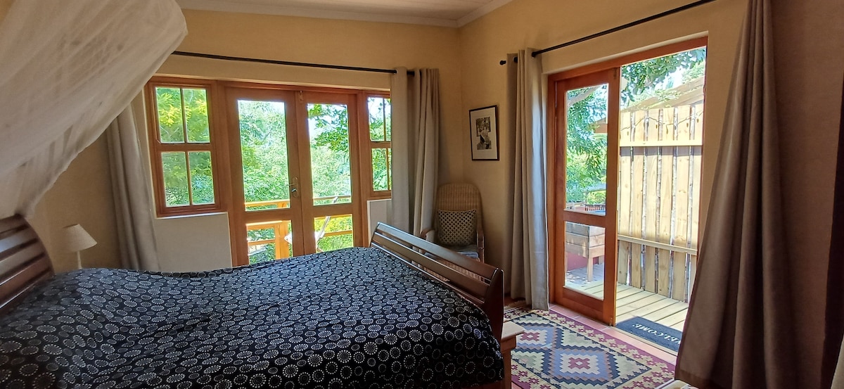 Deze unieke woning ligt in het hart van het dorp en biedt toch sereniteit en rust. Het heeft een prachtig uitzicht over de tuin en het dorp op de Langebergbergen. Compact en toch ruim. Optie voor kingsize bed of twee eenpersoonsbedden. En een inloopdouche. De keuken heeft een inductie 2 plaat en magnetron. En de mogelijkheid om praktische kooklessen te hebben voor The Kitchen Couple van Michelle Berry die eigenaar was van de bekende Mez Karoo Kitchen is ook een optie!