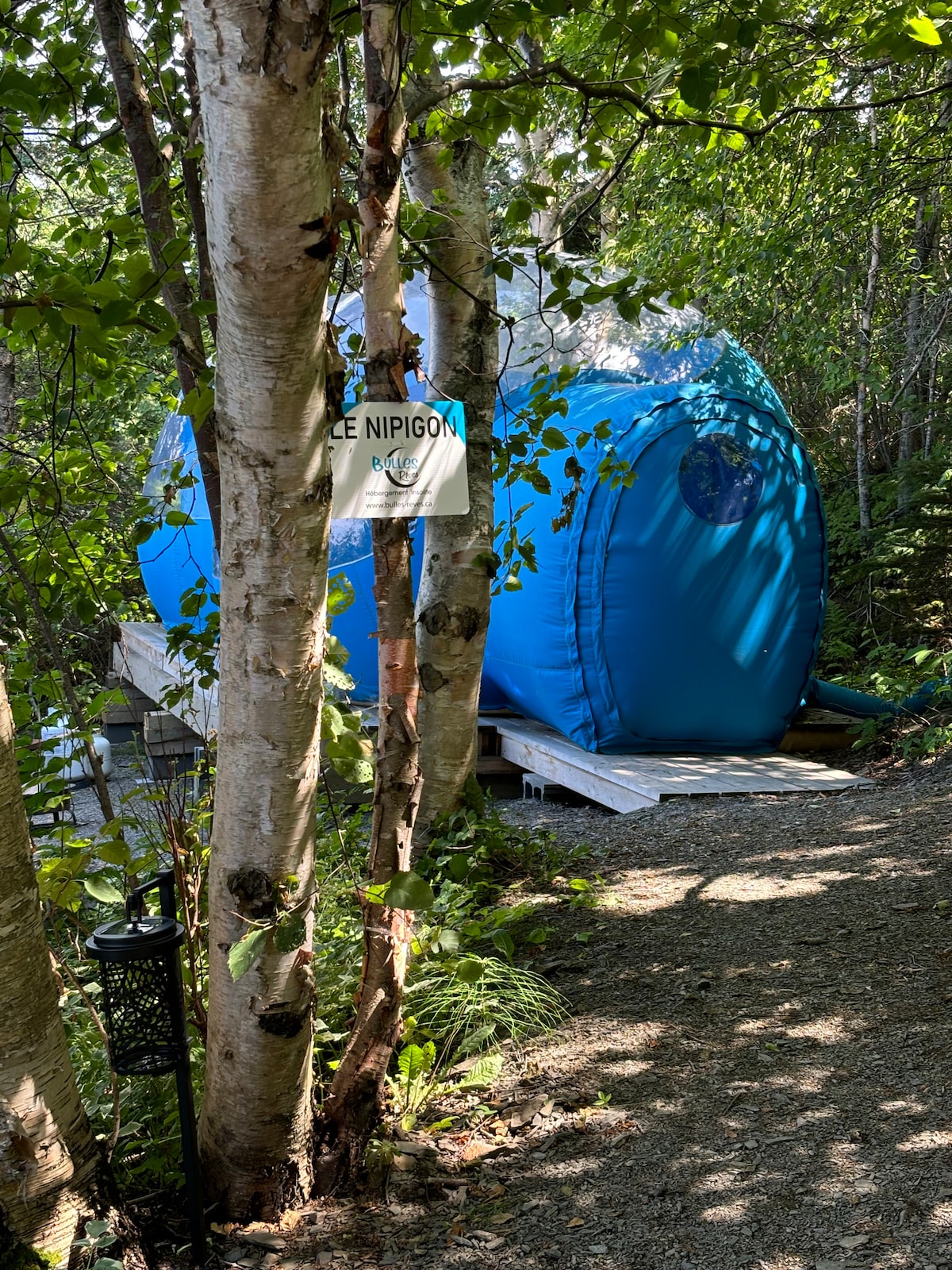 La bulle Nipigon offre à ses occupants une vue magnifique sur le fleuve et une expérience inoubliable. La bulle d'une dimension de 5 mètres de diamètre pourra accommoder de 2 à 4 personnes confortablement. L'espace contient un lit queen, un frigo, cafétière keurig et chauferette électrique. Literie sur place au besoin, bien que nous vous suggérons d'apporter vos sacs de couchage. La bulle est déposée sur une terrasse aménagée équipée d’un BBQ , vaisselle pour 4, foyer et propane inclus .