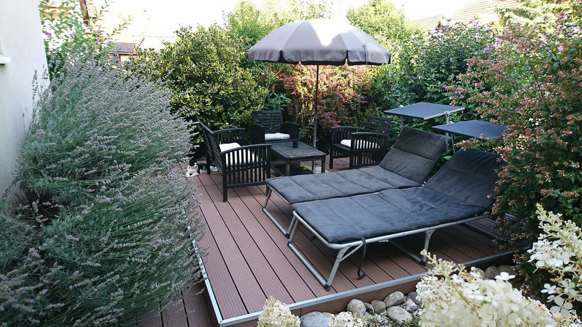 Nieuwe zolder met een groot terras, ideaal gelegen in de buurt van alle voorzieningen (luchthaven, treinstation, tram, restaurant, supermarkt, bar) en 2 minuten van de Zwitserse grens. Tramhalte (lijn 3 - Basel) voor het appartement. Gelegen op de bovenste verdieping zonder lift is het inclusief: 1 tweepersoonsbed, een slaapbank, 1 badkamer met inloopdouche en toilet, een volledig uitgeruste keuken met toegang tot de woonkamer. Er is ook een parkeerplaats.