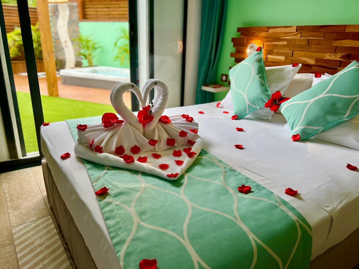 Suite Signature à Kawan Bay Suites Évadez-vous à Kawan Bay Suites**** à Deshaies. Cette résidence intimiste, inaugurée en 2021, offre 12 suites spacieuses avec jardin privatif et mini lagon. Profitez d’un havre de luxe et de tranquillité avec piscine de 27 mètre, bain à remous, beds, paillotes et restaurant. Chaque matin, savourez un petit-déjeuner américain à volonté et bénéficiez de notre room service pour un séjour d’exception.