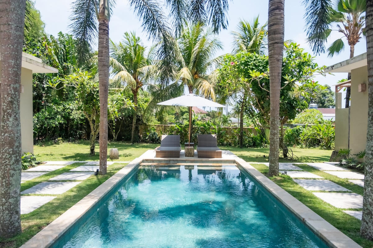 ENTIRE VILLA 5 minutes from Senggigi this 3 Bedroom “U” shaped Villa with a central 4x8 Mtr Private Swimming Pool set in a spacious garden. 1 master and 2 guest bedrooms (each w/ private bath and A/C) in Kerandangan. Minutes from Coco Beach, Puri Mas, Qunci Villas, Sudamala and Katamaran Resorts. On site parking and security guard overnight. Caretaker on site / Laundry service available. Accommodates 6 people (only).