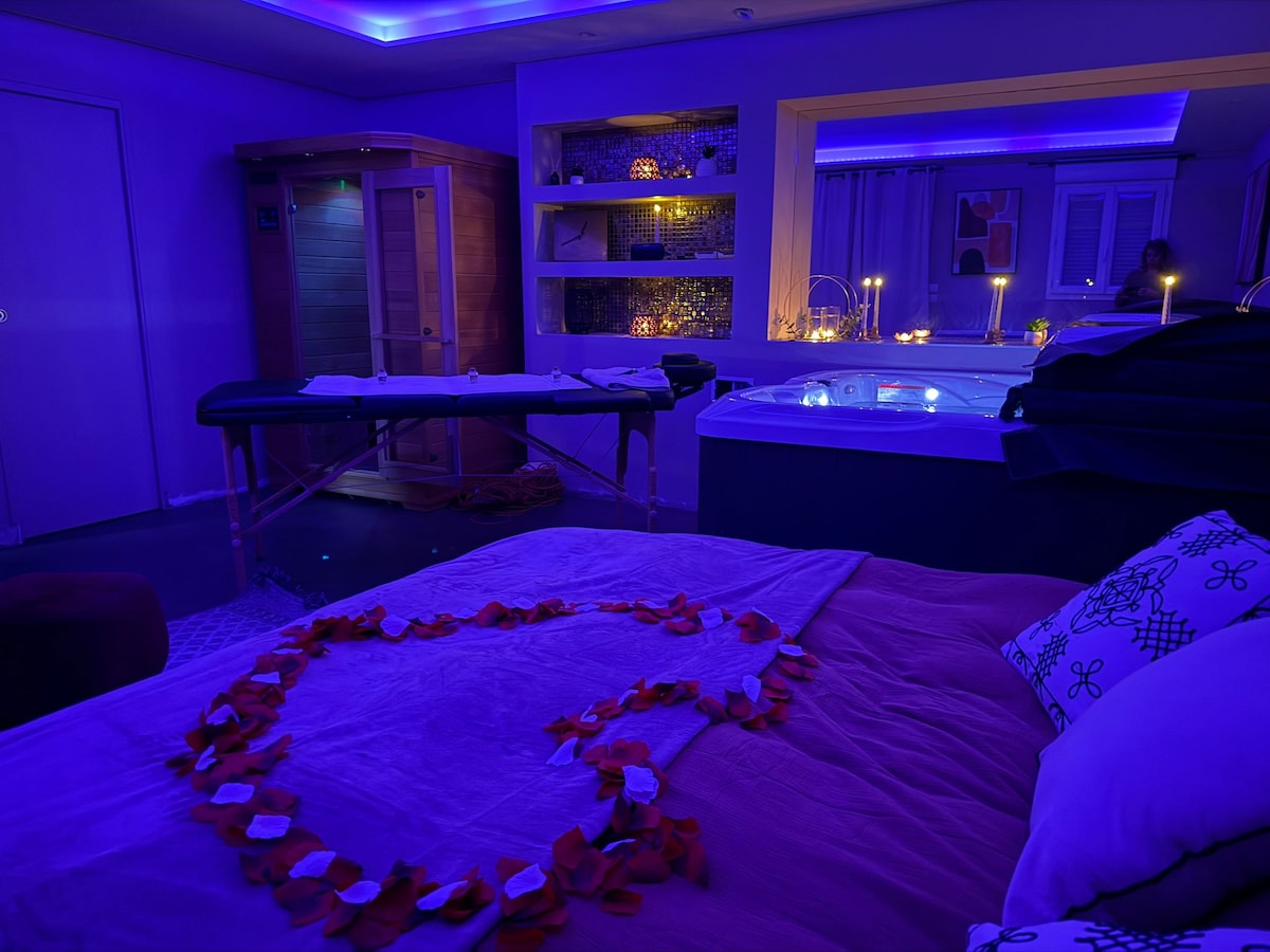 Évadez-vous le temps d'une nuit inoubliable dans notre Love Room, avec balnéothérapie, home cinéma et table de massage . Plongée dans un bain de détente Et de passion dans un cadre Jungle conçu pour sublimer chaque instant à deux.