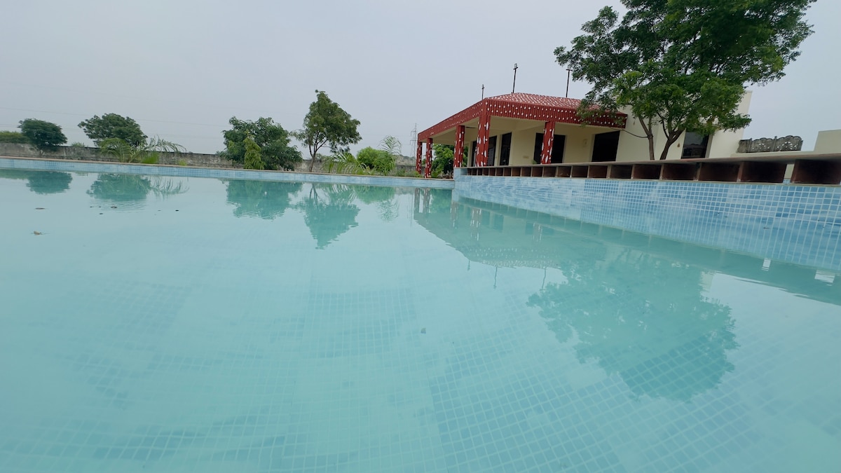 Geniet van de geluiden van de natuur wanneer je in deze unieke plek verblijft. Met 2 grote slaapkamers en een keuken en lobby met wifi tv 15+ ott Het heeft een zwembad voor zowel kinderen als volwassenen en het heeft ook automatisch reinigingspompen Met 6000 vierkante voet oppervlakte waarvan de helft landbouw en een tuin met een aantal ritten Je zult genieten van de rustige omgeving van die plek waar je diners bij kaarslicht kunt hebben En je kunt ook eten bestellen bij zomato sweegy etc.