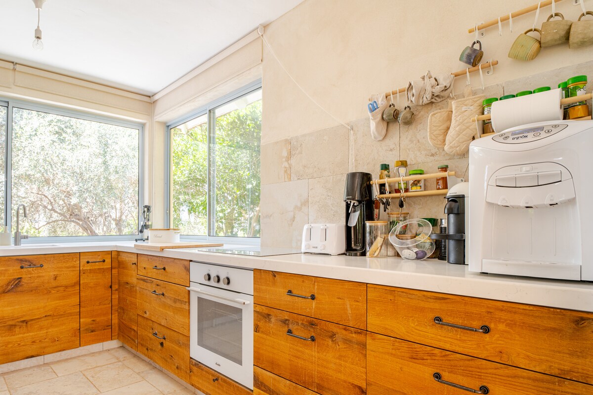*Voor iedereen die geïnteresseerd is om te verblijven tijdens deze unieke periode van de oorlog met Iran... het huis heeft een schuilkamer, en het aantal sirenes hier is nul.* Ben je op zoek naar een rustig uitje, dicht bij de natuur en een duik in het uitzicht? Dan is dit de perfecte plek voor jou. Welkom. Het huis wordt gekust en gaat op in het Beit Keshet-bos. Hier kun je samen voelen, eten voor je bereiden en dingen doen waar je van houdt, ontspannen op het houten balkon, genieten van de rust en de geluiden van het bos, een duik nemen in het zwembad op de warme dagen, opwarmen voor de open haard en tijd doorbrengen in de sauna op de koude dagen. * *Houd er rekening mee dat het huis is gelegen in een woonwijk die rust en natuur behoudt, het is een belangrijke waarde voor bewoners. * *