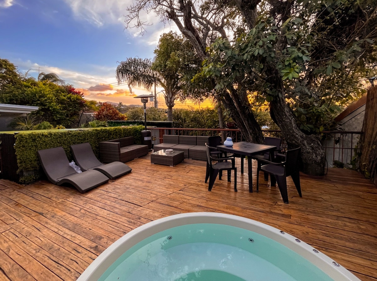 Tomate un descanso y relajate en este tranquilo B&B ubicado frente a un lindo parque en un residencial seguro a tan solo 15 minutos del aeropuerto de San Jose SJO y del centro de la ciudad. Areas compartidas incluyen amplia terraza con jacuzzi con agua caliente, mesas, sillas jardin y exuberante vegetación . Habitación con cama king, aire acondicionado, tv pantalla plana, wifi, baño privado con ducha,jacuzzi y agua caliente. Renta vehiculos a precios accesibles. Snack bar & desayunos