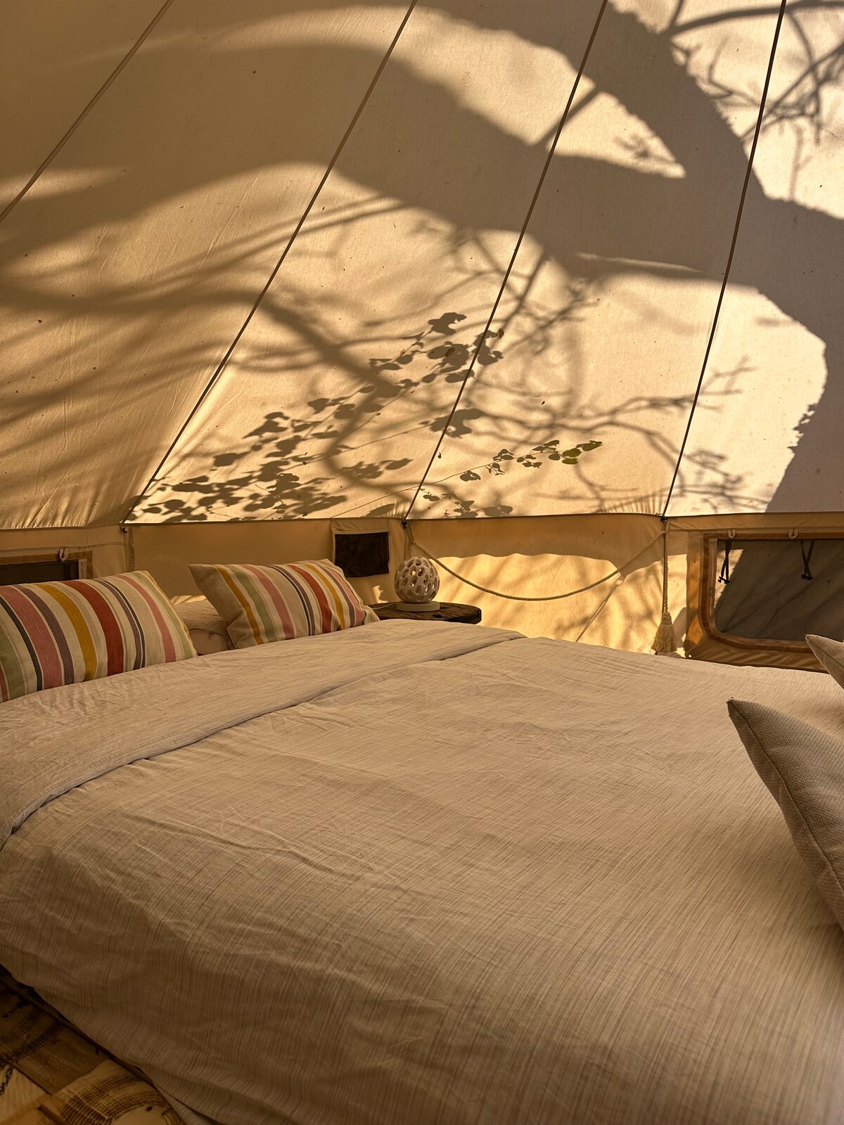 Welkom in onze prachtige bell-tent op het veld. Hou je van het buitenleven maar toch ook van wat luxe kamperen, dan ben je bij ons helemaal op je plek. We verhuren het achterste plekje op ons veld, hierdoor kan je genieten van voldoende privacy en helemaal tot rust komen. Maak een gezellig kampvuur, neem je fiets mee of ontdek de omgeving te voet. We wonen tussen de velden maar toch ook dichtbij Diest voor een gezellig uitstapje.