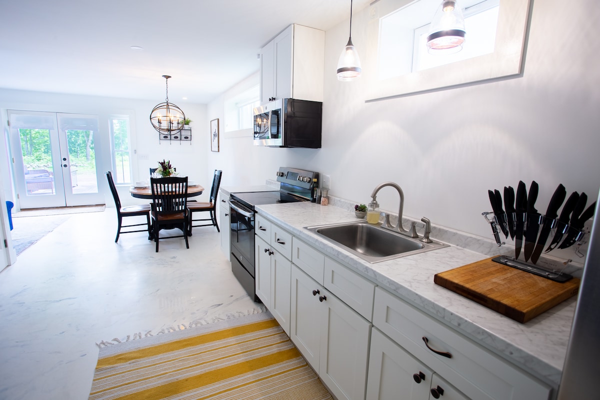 Stap in een afgelegen wijngaardretraite waar elegantie en adembenemende landschappen samenkomen. Deze suite biedt een kingsize bed, modern comfort en een ruime patio pergola met een prachtig uitzicht op de wijngaard en de bergen. Geniet van een goed uitgeruste keuken, eet- en woonkamer, of ontspan in het nieuwe gedeelde bubbelbad — perfect voor romantische uitjes of langere verblijven. Hoewel andere gasten de accommodatie delen, is deze ruimte voor jou om van te genieten. 5 minuten naar Lake Winni, 20 minuten naar Wolfeboro, 25 minuten naar Gunstock & Bank of NH Pavilion.