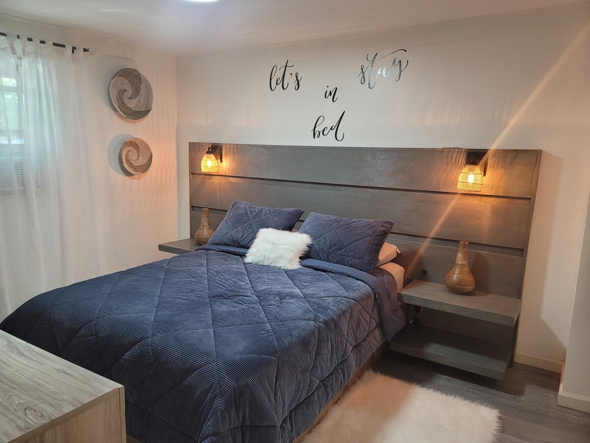 Benedenverdieping unit met eigen ingang en parkeerplaats, **actieve oprit** in een gedeelde woning. Met zorg samengesteld voor een gezellige sfeer en een rustige spa-achtige ervaring. Deze kamer heeft een verstelbare queensize bed, een eigen badkamer en toegang tot een eigen en volledig omheinde achtertuin 24 uur per dag, perfect voor koppels die op zoek zijn naar een rustig romantisch uitje! Lees de beschrijving van onze buurt en accommodatie en *andere details om op te merken* voor zeer belangrijke informatie die je niet wilt missen.