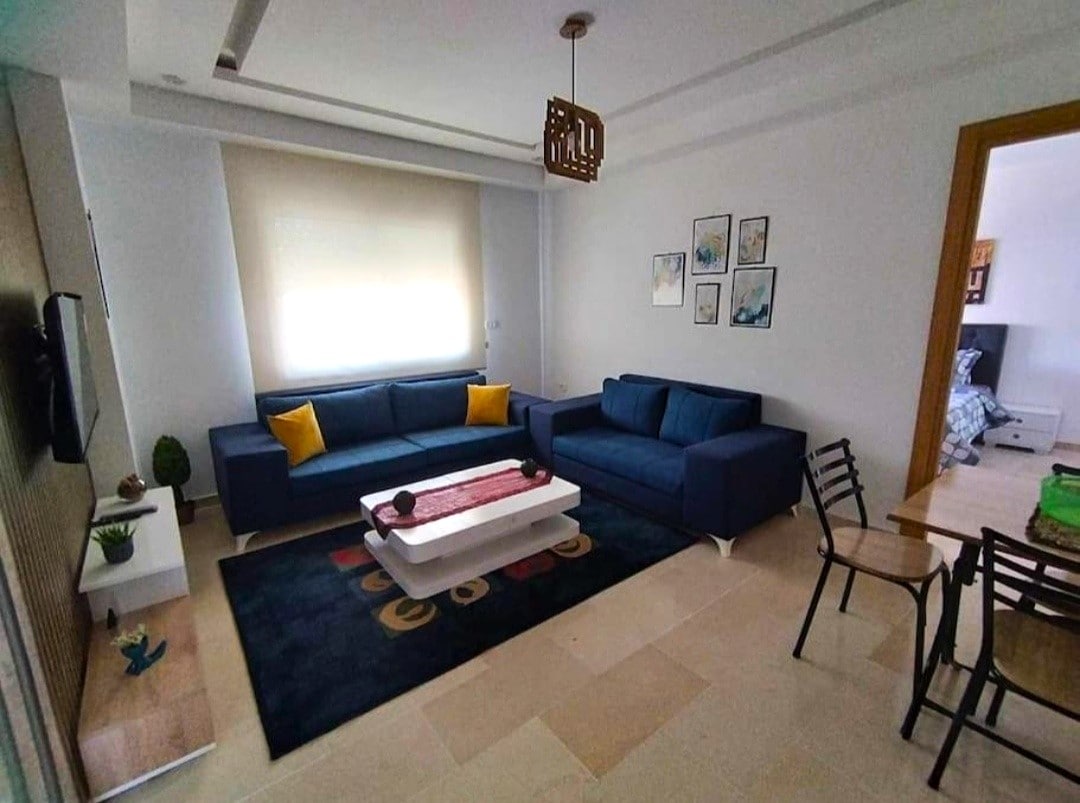 Nieuw appartement goed gelegen en dichtbij alle voorzieningen in de zuidelijke buitenwijken van Tunis in een rustige en beveiligde residentie (Zahret el Medina) Het is een rijkelijk ingerichte S+1 bestaande uit een Amerikaanse keuken, een bar, een ruime en lichte woonkamer met een balkon en een badkamer met een inloopdouche en een slaapkamer. Ideaal voor een stel of meer (mogelijkheid om meer slapen te installeren).