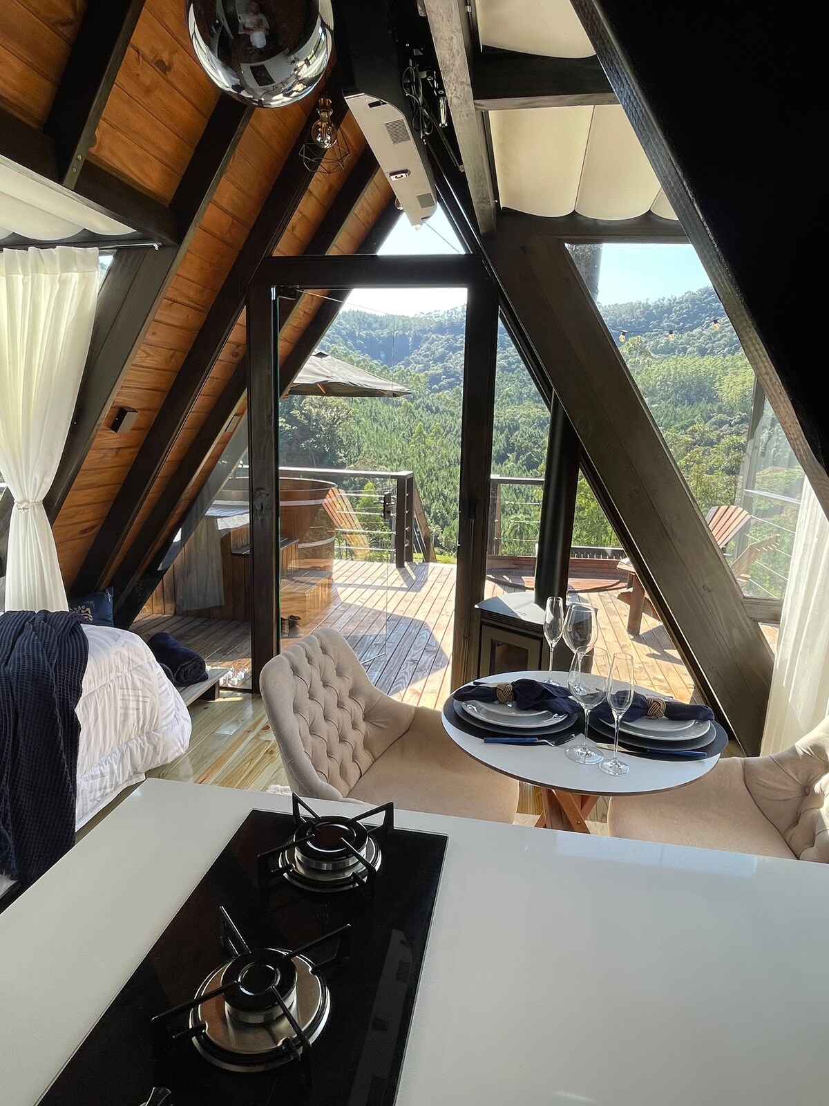 Ontspan in deze rustige en stijlvolle ruimte, op 15 km van het centrum van Doutor Pedrinho, in de buurt van Cachoeira Véu de Noiva, in een privéboerderij. Romantische hut met binnenbad, rustieke keuken, open haard, rustieke badkamer met boomstam wastafel, gasverwarmd water, tussenverdieping en grote ramen om van de natuur te genieten. Buitenruimte met groot terras, vuurplaats en hangmat tussen de bomen. Kom en ontdek deze ruimte die met veel liefde en genegenheid is gecreëerd! 💙🏡🌑
