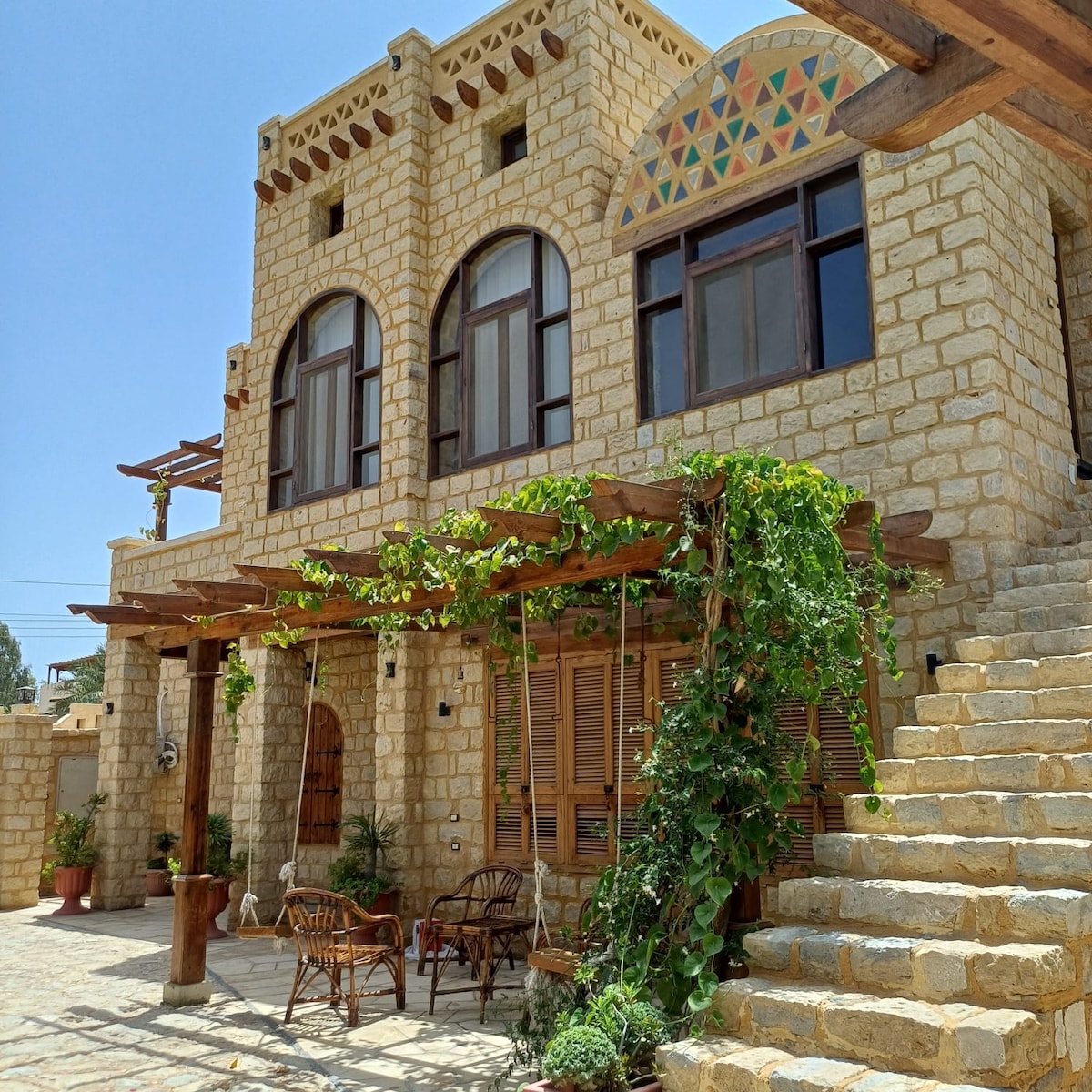 Welkom bij Villa Kemet, ontworpen door een lokale architect (gewelven, gekleurde stenen, typische Fayoum-mastaba's). Rustig op het platteland, maar dicht bij alle voorzieningen (5–10 minuten lopen). Geniet van het privézwembad en de aangelegde tuin met barbecue, ligbedden en een houten tafel. Warme en ruime villa met exclusieve inrichting: 4 slaapkamers, 2 keukens, 2 woonkamers, een open haard, 3 badkamers/toiletten – alles is aanwezig zodat u uw batterijen kunt opladen.