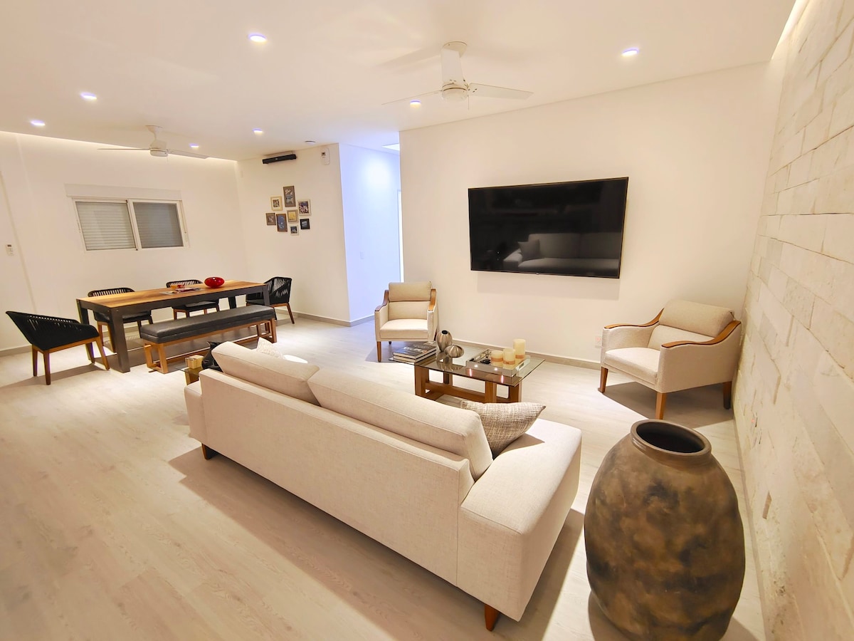 Spend a calm, relaxing, warm vacation at this luxury suite. Its beautiful decoration and tranquil location gives you the harmony needed for resting at one of the top destinations in the world: Cancun. The suite has a large bedroom with a king size bed, equiped kitchen, AC, fast wifi, 65” TV with subwoofer with Netflix and HBOmax, living room, terrace, and full security around the condo. The common area includes a tennis court, large pool and access to the beach!