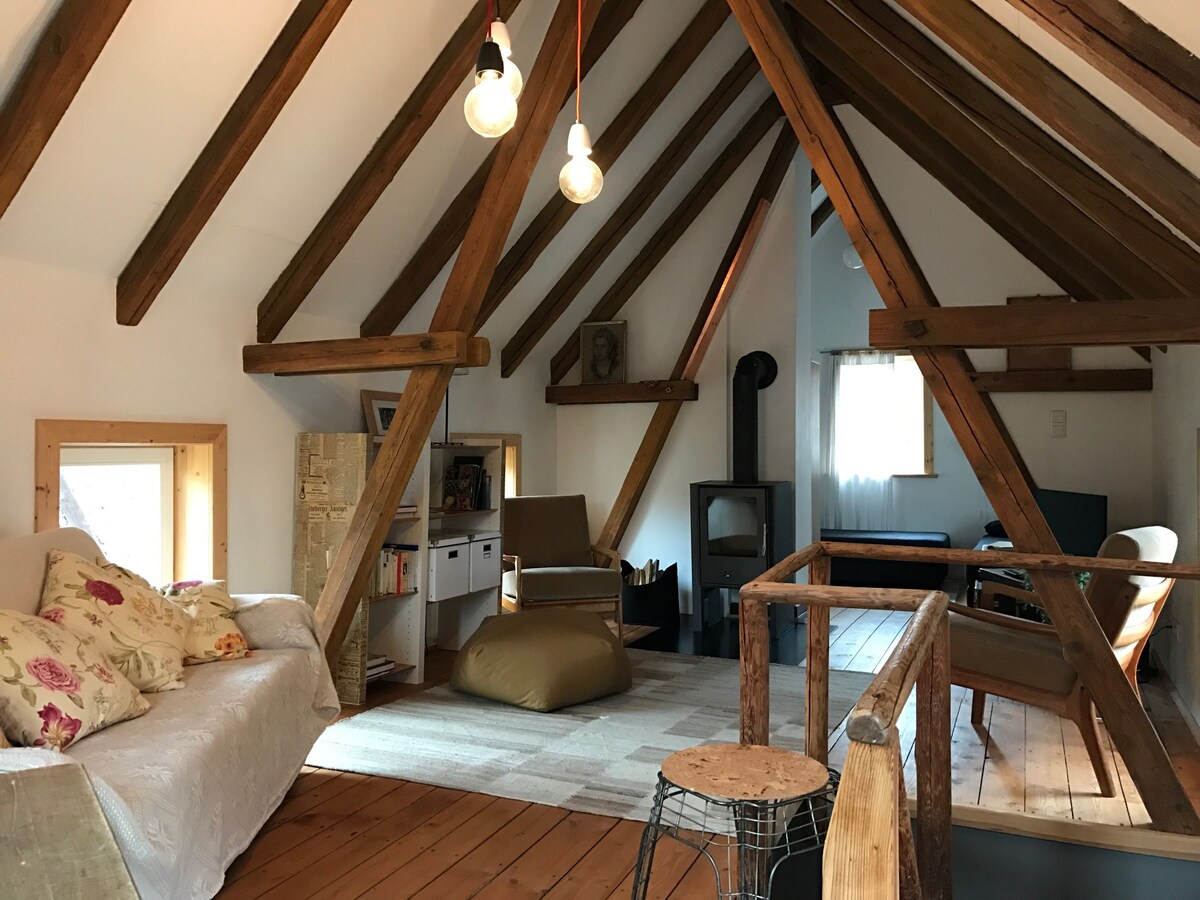 Onze bosloft van 70 m² met terras van 30 m² ligt in de idyllische omgeving van het Thüringerwoud en biedt een pittoresk toevluchtsoord voor kunstenaars, koppels en vrije geesten. Laat je in slaap vallen door het gekraak van de open haard en wakker worden door het fluiten van vogels. Of het nu gaat om creatieve inspiratie, romantische momenten of het verkennen van de natuur - je vindt de perfecte plek voor je time-out op ons terrein van 2000 vierkante meter.