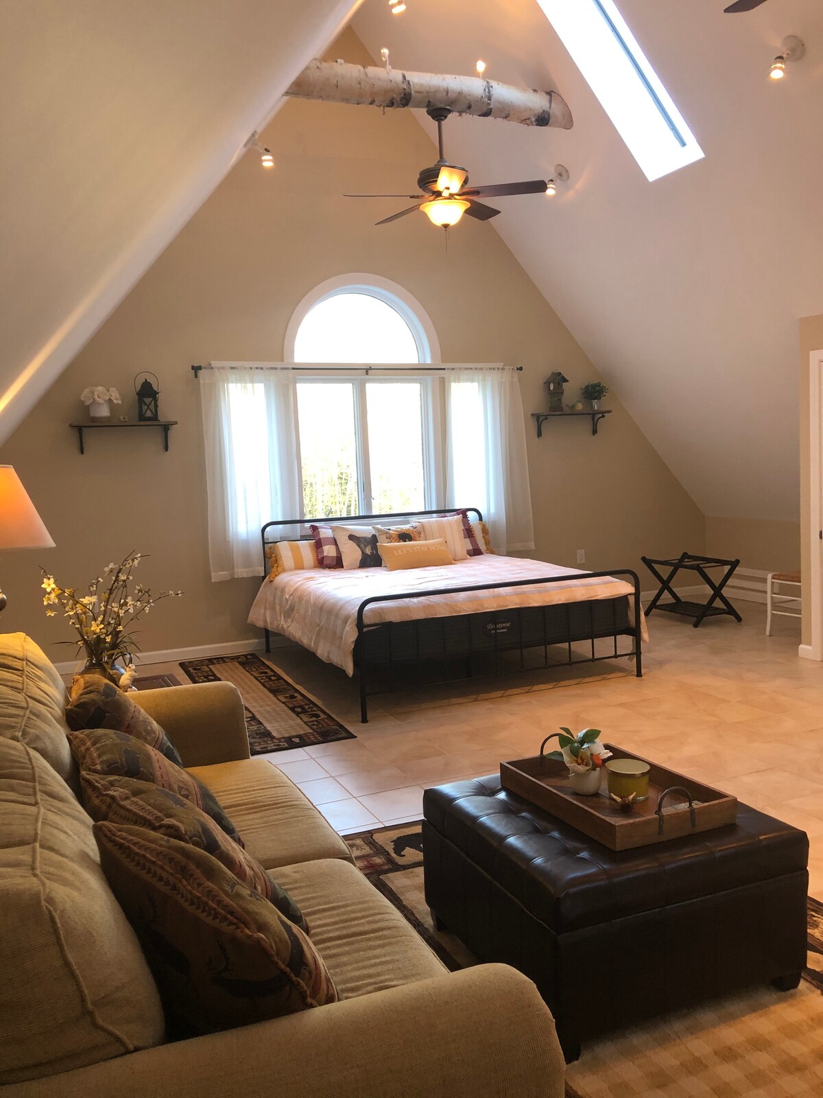 King bed en berken balken heersen deze natuur geïnspireerde ruimte. Je hebt alleen toegang tot een mahonie dek, perfect voor 's ochtends koffie of wijn' s nachts door een gasvuurplaats. Dakramen, grote ramen, evenals tal van verlichtingsarmaturen zullen uw verblijf opfleuren. Stralingswarmte, 3 plafondventilatoren en airco houden je comfortabel. U bent omgeven door natuur en toch tien minuten van de grootste supermarkt van de provincie en centraal gelegen van alle culturele locaties en wandelpaden van Berkshires.