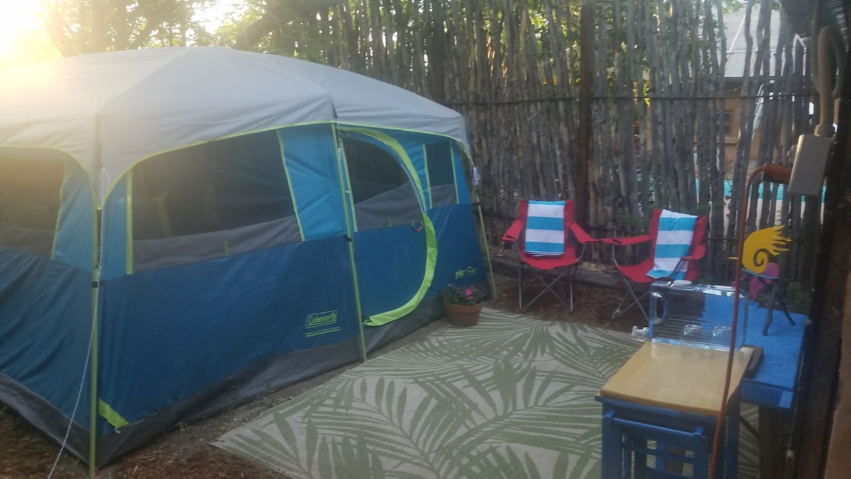 De glamping site bevindt zich in een geheime ruimte op 1 en 2/3 hectare met een zwembad en bubbelbad. We hebben twee kamers in huis en een casita en enkele kampeerders op het terrein versierd met Ed Haddaway 's sculptuur. Er is een kampvuur en hamocks om in te ontspannen. Er is een heerlijke buitendouche met warm water. Of je kunt de douche in het hoofdhuis gebruiken, op een steenworp afstand van de glampingsite. Mensen zitten ook graag op de veranda. Er is stroom aanwezig in de tent om laptops en telefoons aan te sluiten.